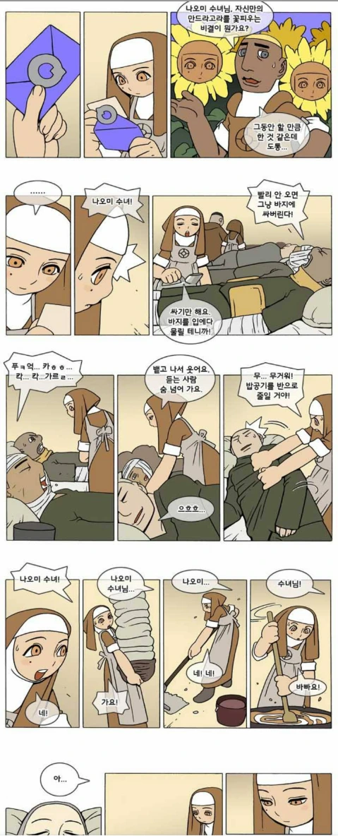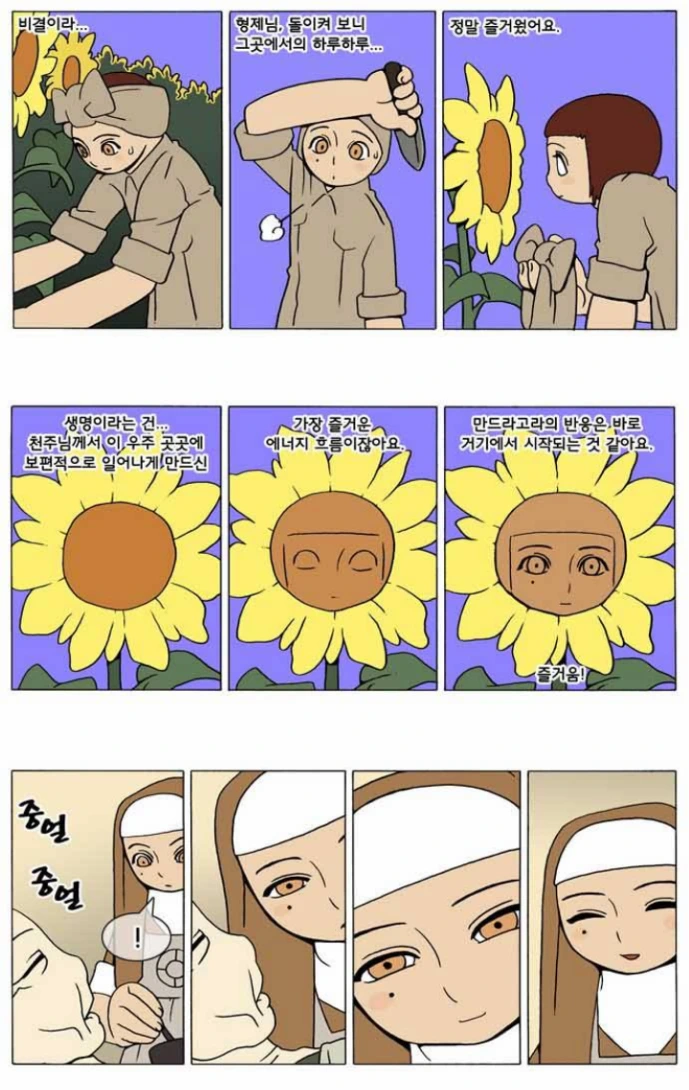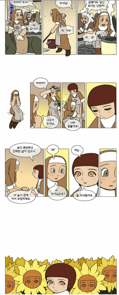 수녀원의 삶이 너무 힘들어서 도망친 나오미 수녀. 하지만 도망쳐서 도착한 곳에서 의외의 물질적 풍요를 누렸음에도 그녀는 그다지 행복하지 못했다. 왜냐하면 그곳은 자신이 원했던 곳이, 자기가 즐거운 곳이 아니었으니까. 복에 겨운 말일 수도 있겠지만 나오미는 만드라고라를 재배하는 농부일 때나 병자를 간호하는 간호사일 때나 신의 종으로 하루종일 신에게 기도를 올리는 수녀일 때가 가장 생명력이 넘치고 즐거웠다는 것을, 그 장소를 떠나고서야 깨달을 수 있었던 것이다.
