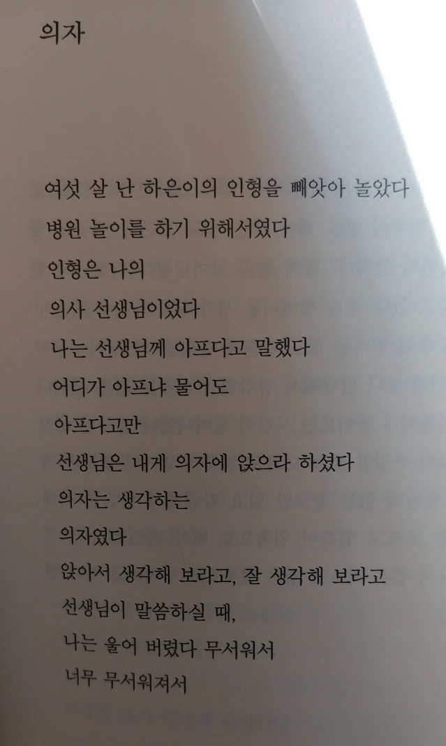 오늘은 황인찬 시인의 의자라는 시를 읽으며 출발해보자. 우리는 여섯살 때나 더 나이를 먹은 지금에나 놀이를 좋아한다. 독일의 시인 프리드리히 쉴러같은 사람이 말한 것처럼, 실로 '인간은 놀 때야말로 인간'인 것이다. 그래서 때로는 즐거울 때 뿐만이 아니라 내 과거의 아프고 어두운 상처와 흉터를 더듬을 때도 놀이라는 형식을 빌리기도 한다. 이 시의 병원놀이처럼, 사실 우리가 웹툰이나 영화를 보고 캐릭터나 상황에 감정이입을 하는 것도 크게 보면 하나의 놀이일 것이다.