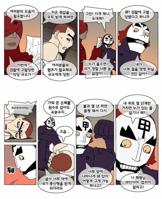 물론 이런 약쟁이 범죄자 지로조차도 그저 태어날 때부터 쓰레기는 아니었고, 한때는 동지들과 함께 법의 힘을 빌려서 악당 규오에 대항하려 했다. 허나 검찰에 악당을 고발했음에도 오히려 보복을 당하고 심지어 가족이 노예로 팔려나가기 직전까지 몰리자 지로와 지로의 어머니는 그저 자기 살 길만 찾는, 나와 같이 흔해빠진 나약한 보통 인간의 밑바닥을 그대로 보여주며 악당에게 동지를 팔아먹는다.
