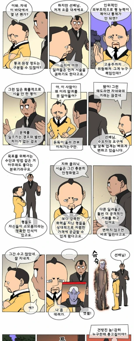 허나 그 3년 동안 제8우주의 퀑 시장은 불법 능력강화 시술과 딜러들의 수수료 인하 경쟁 등으로 급격히 요동치며 주완은 퀑 훈련과 장사를 접을까 고민하던 중이었다. 마치 공황 직전의 찬란한 호황을 뽐내는 자본주의 체제 속 주식 시장에서 현명한 투자자는 얼른 현금자산을 확보하고 주식에서 발을 빼듯이. 그런 와중에 3년만에 이목구비가 전혀 달라진 퀑이 3012만원을 들고 찾아왔으니, 퀑 한명에 수십억을 다루던 주완 입장에선 당연히 기억이 안 날 수밖에.