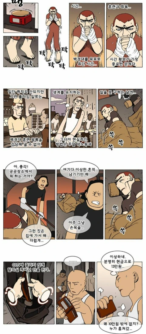 그래서 지로는 이런 제 3의 길을 가기위해, 고액연봉을 받는 경호노동자 백경대가 되기 위해 막노동을 하면서 좀도둑질을 하고 동시에 체력단련도 소화하는 의외성을, 이런것도 인생의 길이라고 할 수 있을까 싶은 길을 보여준다. 아마 사람이, 특히 지로같은 약쟁이가 무슨 고전소설이나 신화처럼 갑자기 개과천선하고 초인적이고 선한 노력을 할 수는 없다는 걸... 양작가는 보여주고 싶었던 게 아니려나.