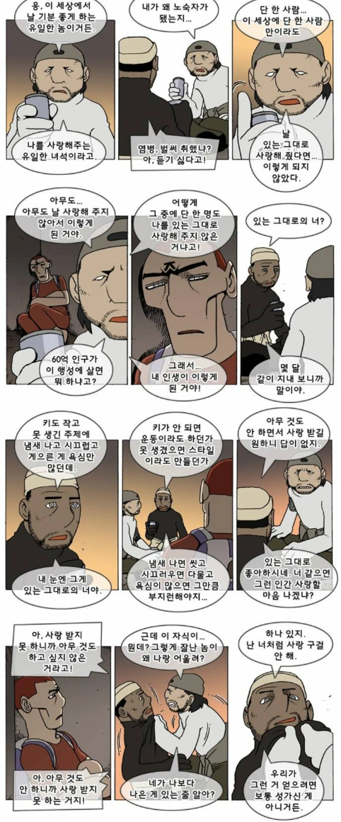 타인의 사랑과 미래에 대한 기대심리를 아에 접으면, 이 덴마의 노숙자처럼 사랑타령도 안 하고 성가시게 살지 않아도 될 것이다. 하지만 정말로 그럴 수 있을까. 자본주의의 신봉자인 유튜버도 아닌, 자본주의에서 미래를 접어버린 노숙자도 아닌 제 3의 길을 지로는 갈 수 있을까. 그리고 우리는 그런 길을 만들 수 있을까. 중국의 대문호, 아큐정전과 광인일기로 유명한 소설가 루신은 자신의 또다른 단편소설 고향에서 정확한 번역은 아니지만 이런 뉘앙스의 말을 남긴 바 있다.