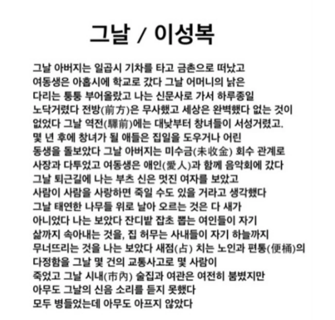 한 시인이 흘린 말처럼 누구나 그 날 당일에는 신음소리를 삼켜냈다 모두가 아파했는데 아무도 병들지 않았다