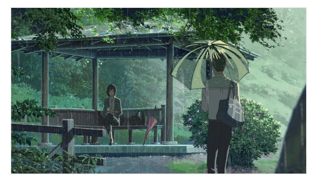 신카이 마코토의 언어의 정원에 나오는 이 둘도 마치 박준처럼 조심히 사랑을 주고받는다. 우연히 일과를 땡땡이치다가 비오는 날의 공원에서 만나 고전시 단가를 주고 받으며 친해진 남녀 타카오와 유키노. 하지만 서로 이름도 직업도 중요한 신상은 묻지 않은 채 도시락을 나눠먹으며 만나다가 기운을 차린 여자 유키노가 복직하자 이 둘은 공교롭게도 학교에서 마주치게 된다.