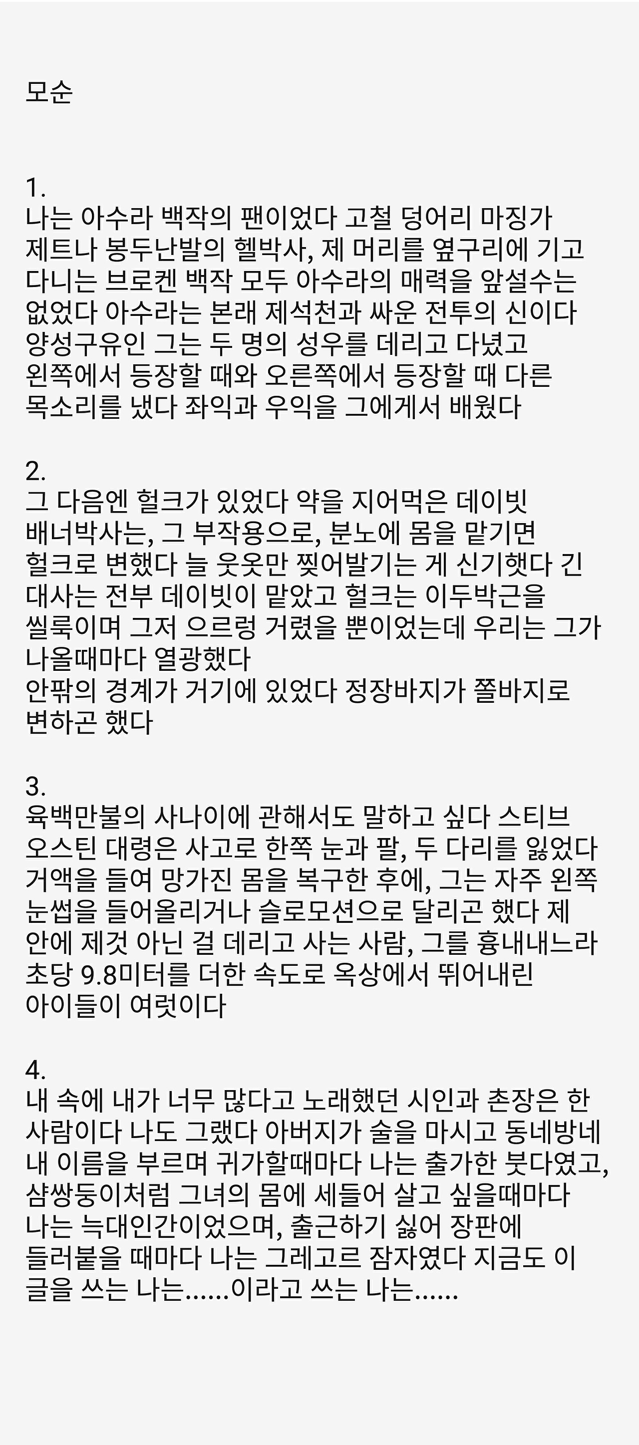 그럼에도 4연에 내 안에 내가 너무나 많다고 노래하던 시인과 촌장은 한 사람이듯 배너와 헐크도 한 사람이다. 술취한 아버지를 피해 출가한 붓다와 출근하기 싫어서 장판에 붙어버린 카프카 소설 변신의 주인공 그레고르 잠자도 내 안에 있다... 그렇다면 헐크와 배너도...
