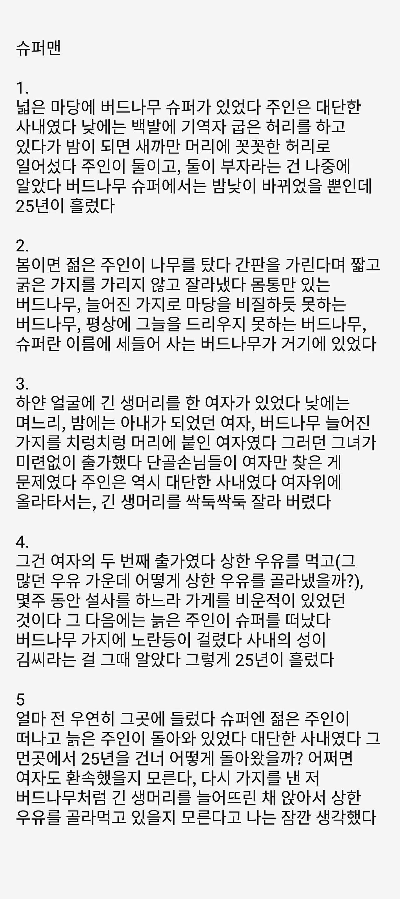 그런데 슈퍼엔 이 부자지간만 있는 게 아니라 생머리의 여자도 있다 어쩌면 슈퍼의 버드나무가 바로 여자인지도 모를듯한 혼동스러운 표현을 시인은 일부러 풍기는 듯하다. 그래서 3연을 읽고 다시 2연을 읽으면 뭔가 함부로 말하기 어려운 위험한 비인륜적인 섹슈얼한 해석조차도 가능해진다...그리고 출가했던 그녀의 생머리를 잘랐다는 표현은 굉장히 원시적인 섹슈얼한 폭력으로도 읽힌다...