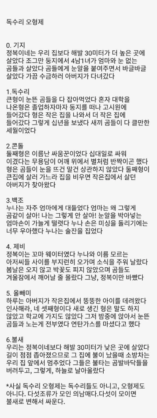 동네에 불이 나니 소방차는 30미터 높은 달동네는 길이 좁아 진입조차 어려웠다 그래서 독수리 오 형제 아니 의남매는 다 같이 불새가 되었다... 사실 지금도 서울에 그런 좁은 동네는 존재하고 고시원도 여전히 존재한다 그곳에도 사람이 산다... 나도 바로 그렇게 여전히 숨을 쉬고 있다