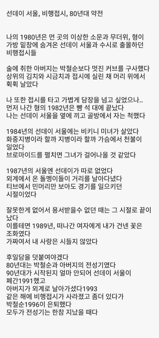 특히 대기업 재벌들이 출자해서 지역연고로 시작한 야구는 순식간에 국민 스포츠가 되었고 박철순 선동열같은 스타는 한국야구의 전설로 지금도 회자된다. 그리고 시에 나오는 아버지도 박철순의 투구를 워낙 인상깊게 보았는지 마치 야구선수를 코스프레하듯 집에서 접시를 커브로 던져댄다. 나보다 먼저 접시타고 담을 넘었던 형은 이미 82년에 한번 나갔다 돌아왔고 시의 화자는 조용히 구석에서 선데이서울을 보며 숨을 죽인다