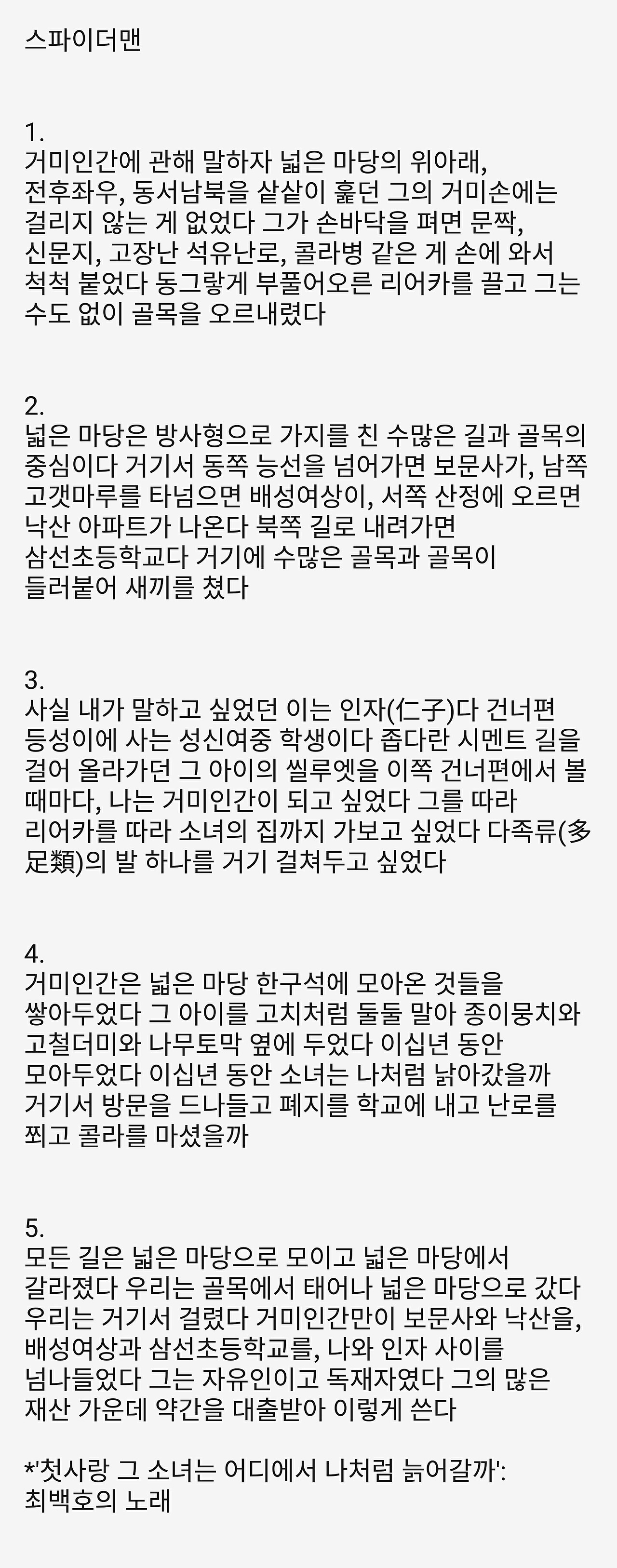 허나 거미인간은 소년만큼 성신여중 소녀를 소중히 생각하진 않았던 걸까 종이더미와 고철더미와 같이 소녀는 구석에 놓여질 뿐이다. 무려 이십 년 동안. 소녀도 나와 같이 폐지를 학교에 내고 콜라를 마시며 늙어갔을까 나의 첫사랑 초등학교 옆자리 그녀도 나처럼 시인처럼 나이를 먹었을까