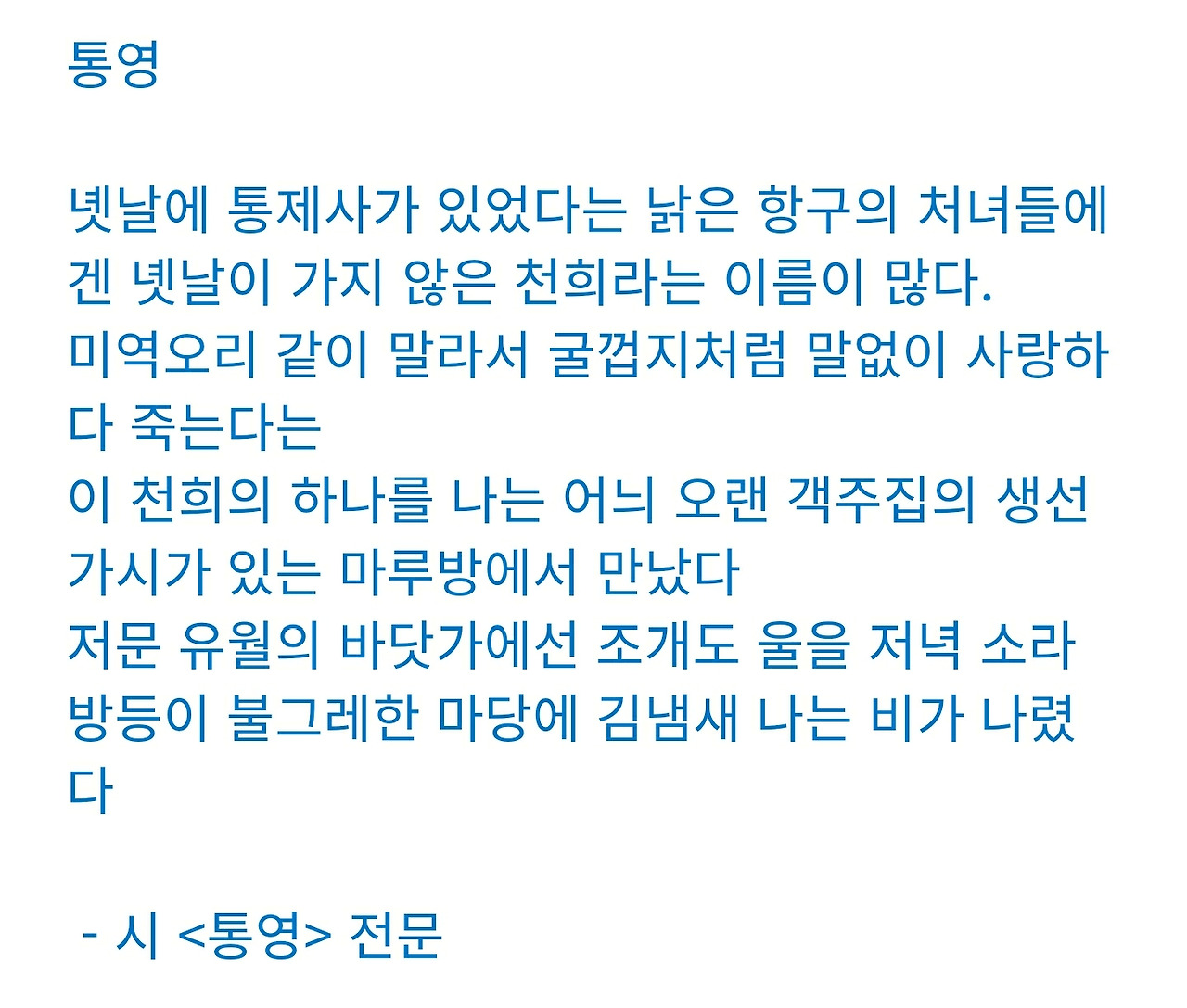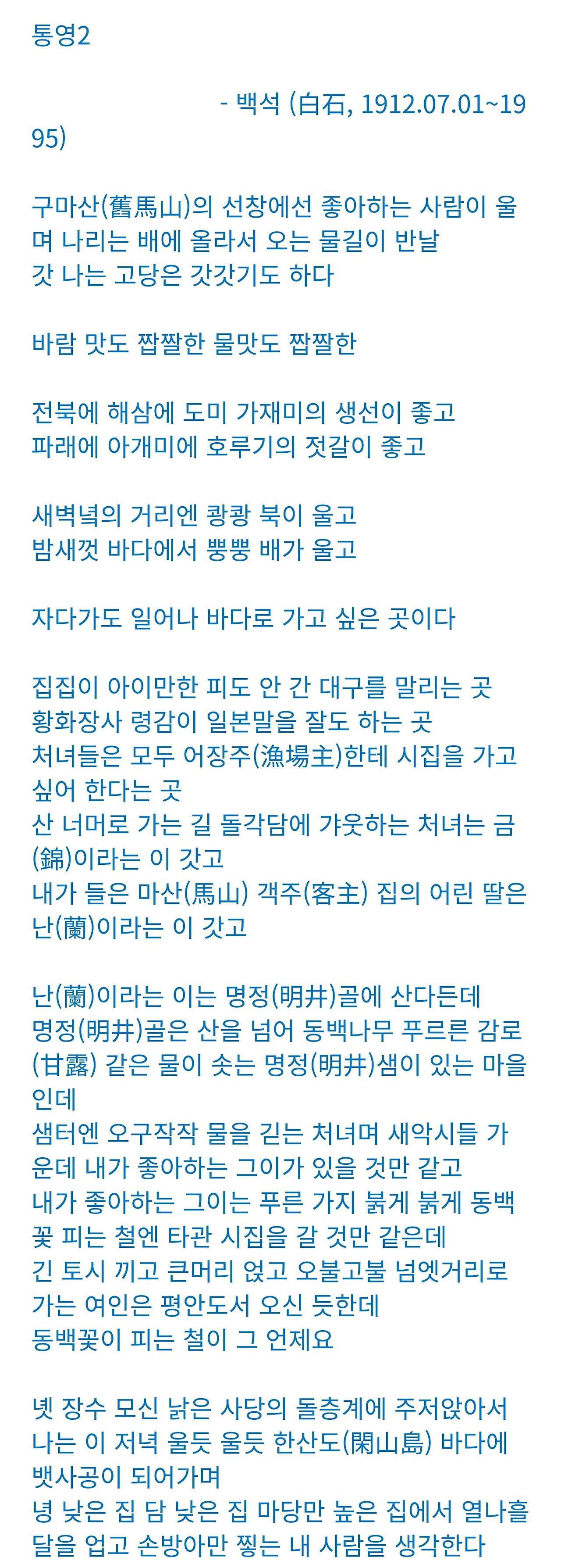 때때로 지역명은 그 자체의 역사와 뉘앙스만으로 하나의 시가 되기도 한다. 박준 시인은 마음 한철 시에서 통영이 동양의 나폴리라 불릴 만큼 아름다운 항구라고 언급하기도 했었지 그런데 함경도 출신인 백석은 무슨 일로 반대편 남쪽 끄트머리 통영까지 갔을까?