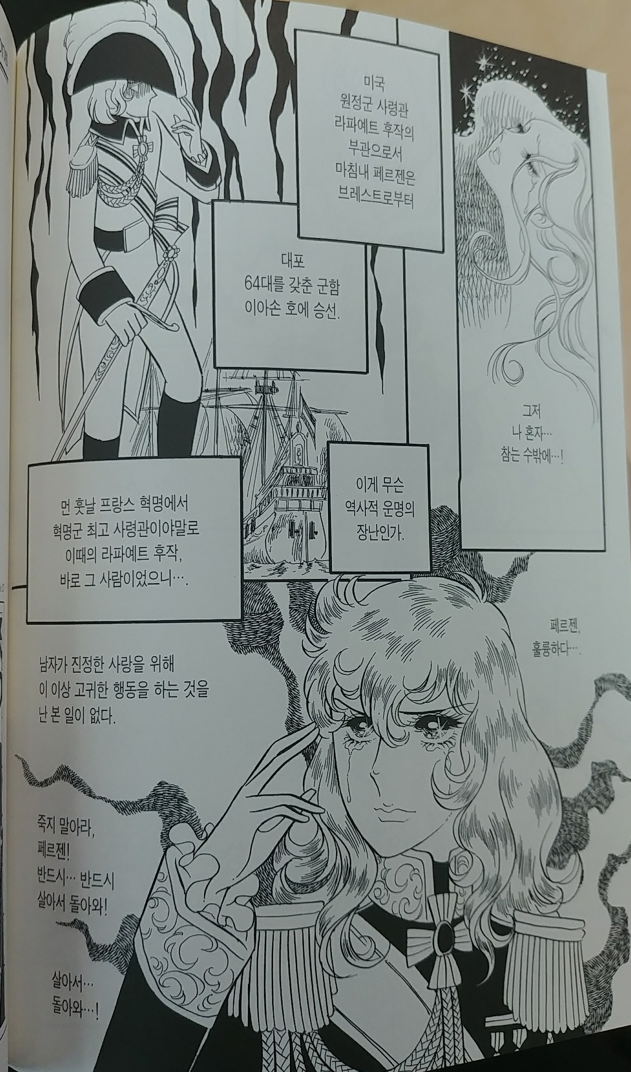 그것은 단순히 마음을 터놓을 친구가 진정한 사랑을 실천하려고 위대한 결단을 내린 것에 감동하고 슬퍼서 나올 수 있는 눈물은 아니리라.남자가 사랑을 위해 이 이상 고귀한 행동을 하는 건 본 적이 없다면서반드시 반드시 살아서 돌아오라고 기도하는 오스칼.오스칼은 이때부터 페르젠에 대한 자기의 마음을 조금씩 깨닫고 있었던 게 아닐까.