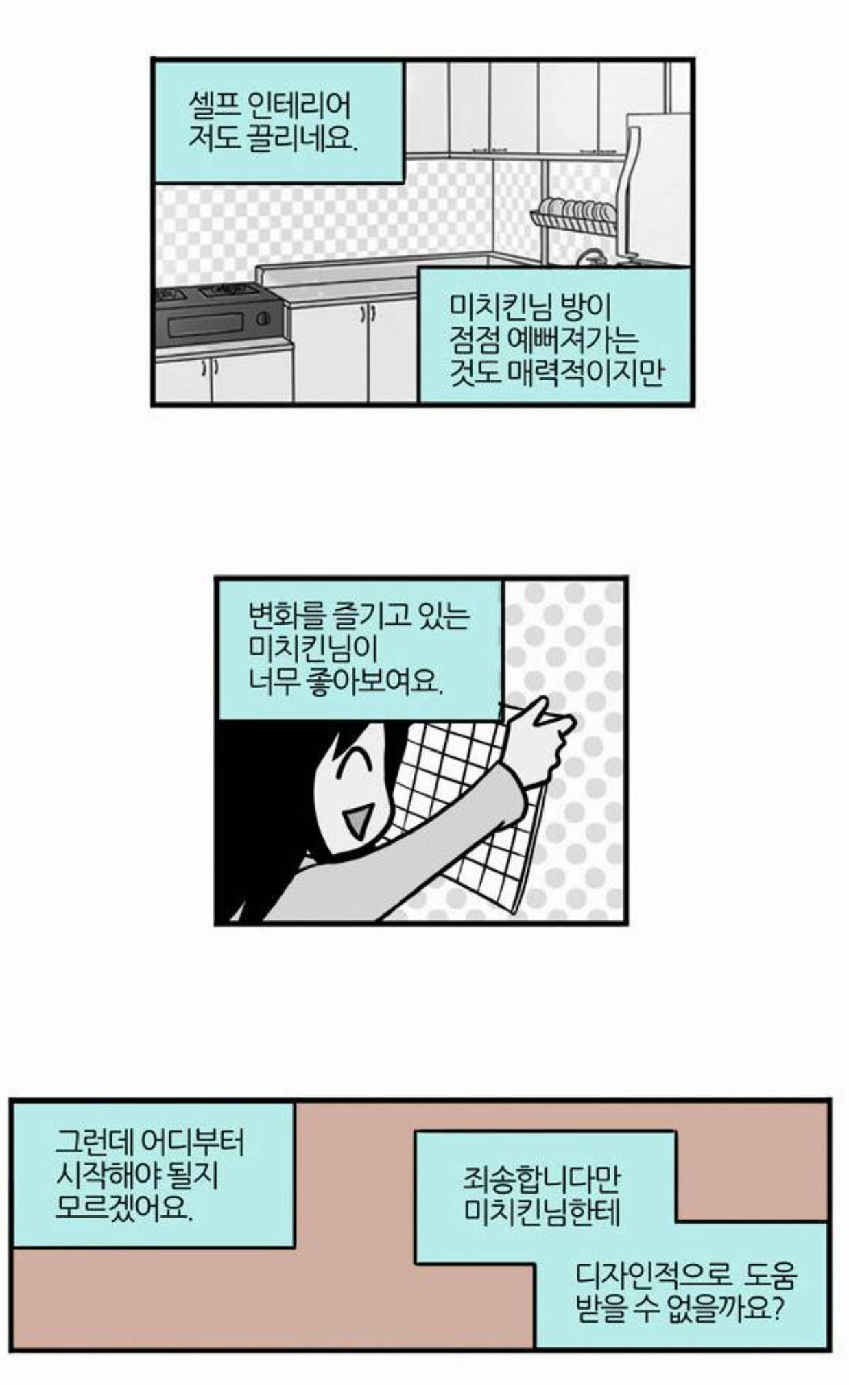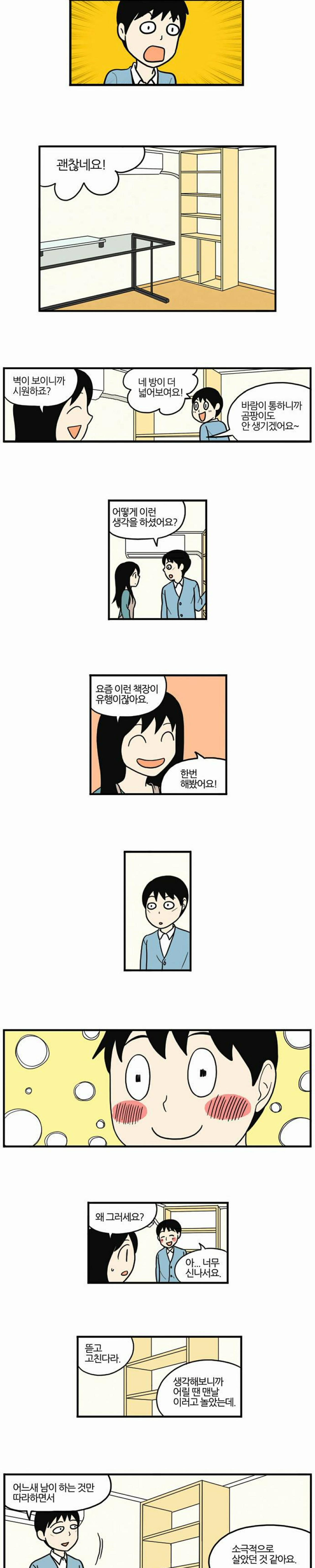 물론 은주는 프로도 아니고 여자 혼자 몸으로 남자 방에 인테리어 해주러 들어간다는 게 부담스럽다. 이를 눈치챈 소꿉친구 민석이는 자기가 함께 가겠다고 하고 심지어 민석이는 직업부터 인테리어 전문가다. 습기 때문에 곰팡이가 필 정도로 심각한 의뢰인의 방에 가서 은주와 민석이는 열심히 방을 치우고 페인트질을 하고 새롭게 가구를 배치하자 방이 환해지고 사람의 표정도 환해진다.