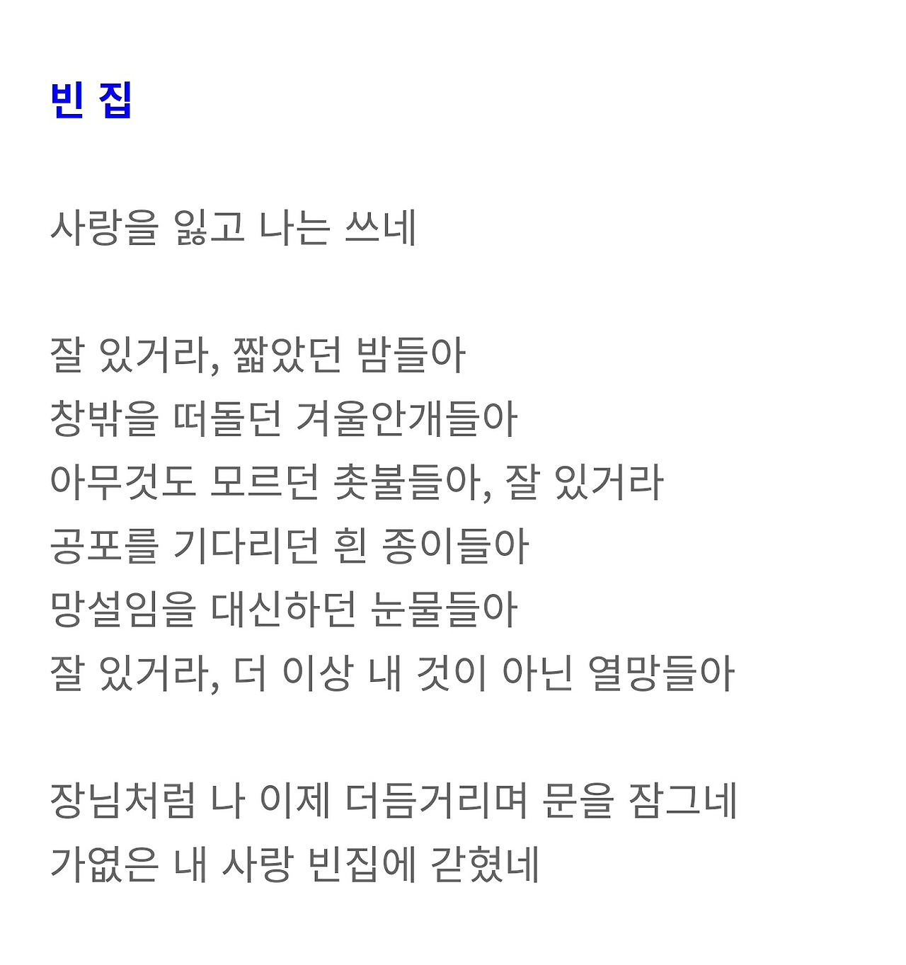 사랑을 하고 연애를 시작하면 세상이 장밋빛으로 보인다는 말처럼, 사랑을 잃고 연애가 끝나면 반대로 세상은 빛을 잃고 무채색으로 변해버린다. 그런데 무채색이 바로 연필이나 볼펜의 색깔이라 그런 걸까 그 상실의 슬픔 애도하는 마음은 자기를 자꾸 입 속에 갇혀 있는 걸 거부하는 듯하다. 특히나 실연 후에 홀로 아무도 없는 방에 들어올 때, 기형도 시집 제목처럼 입 속의 검은 잎은 튀어나오려고, 가엾은 내 사랑 빈집에 갇혔지만 펜을 들면 어떻게든 나오려고 몸부림치며 애쓰는 듯하다.
