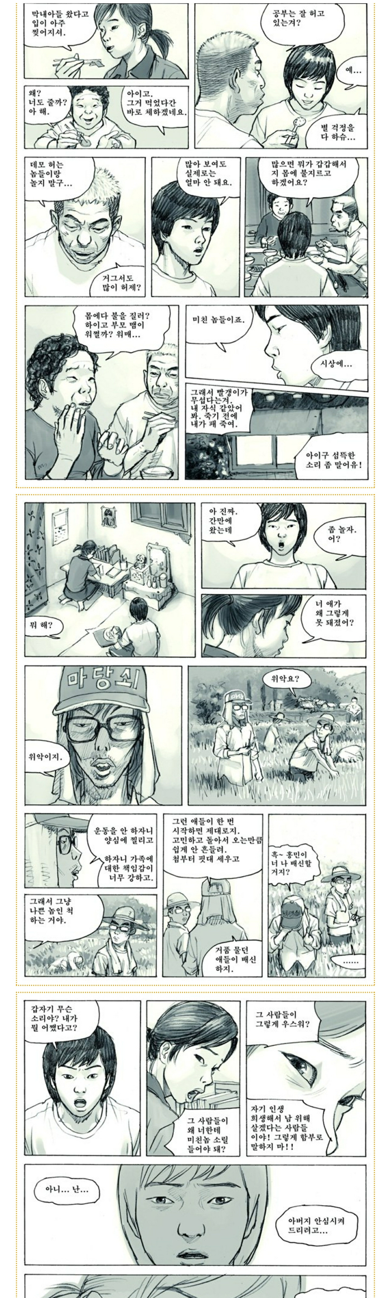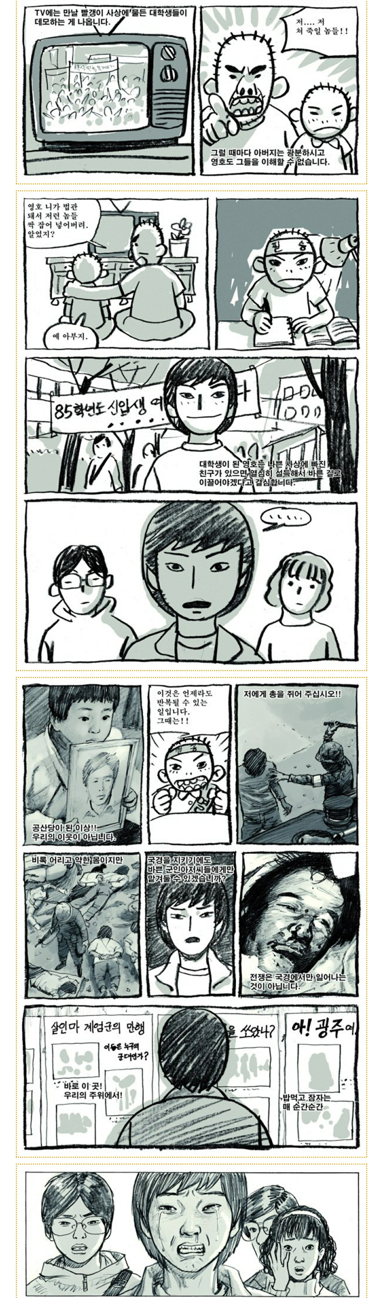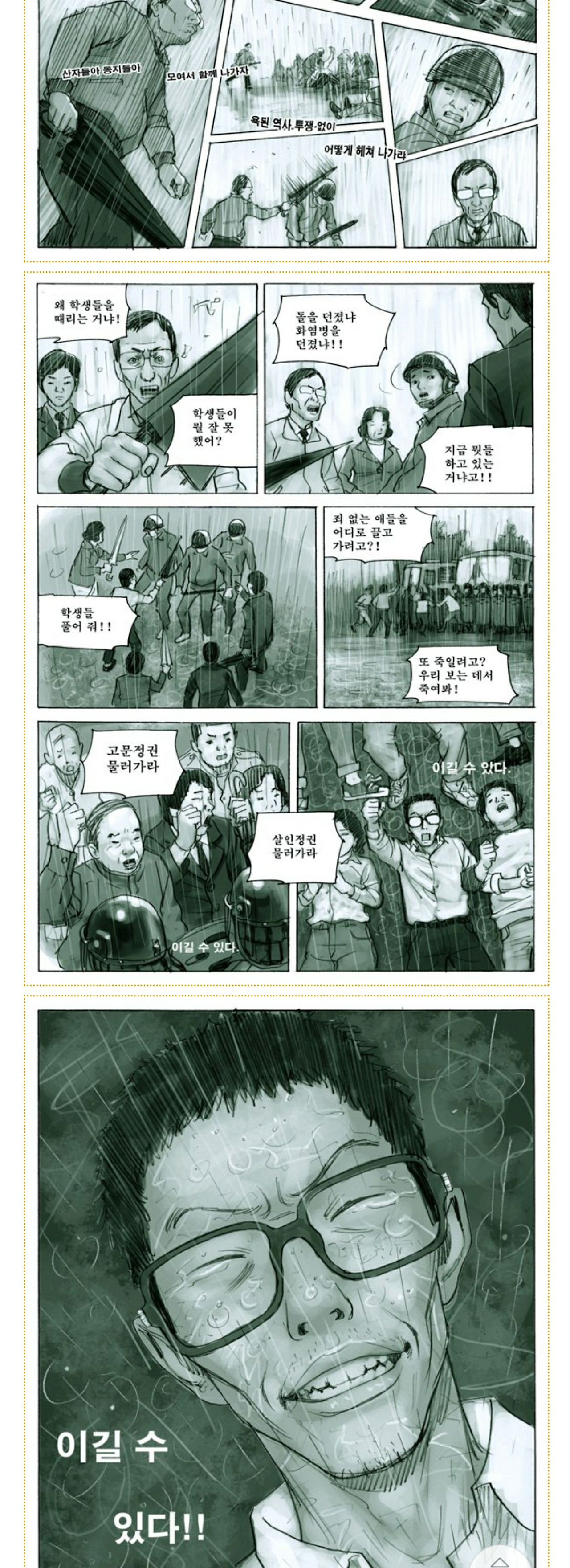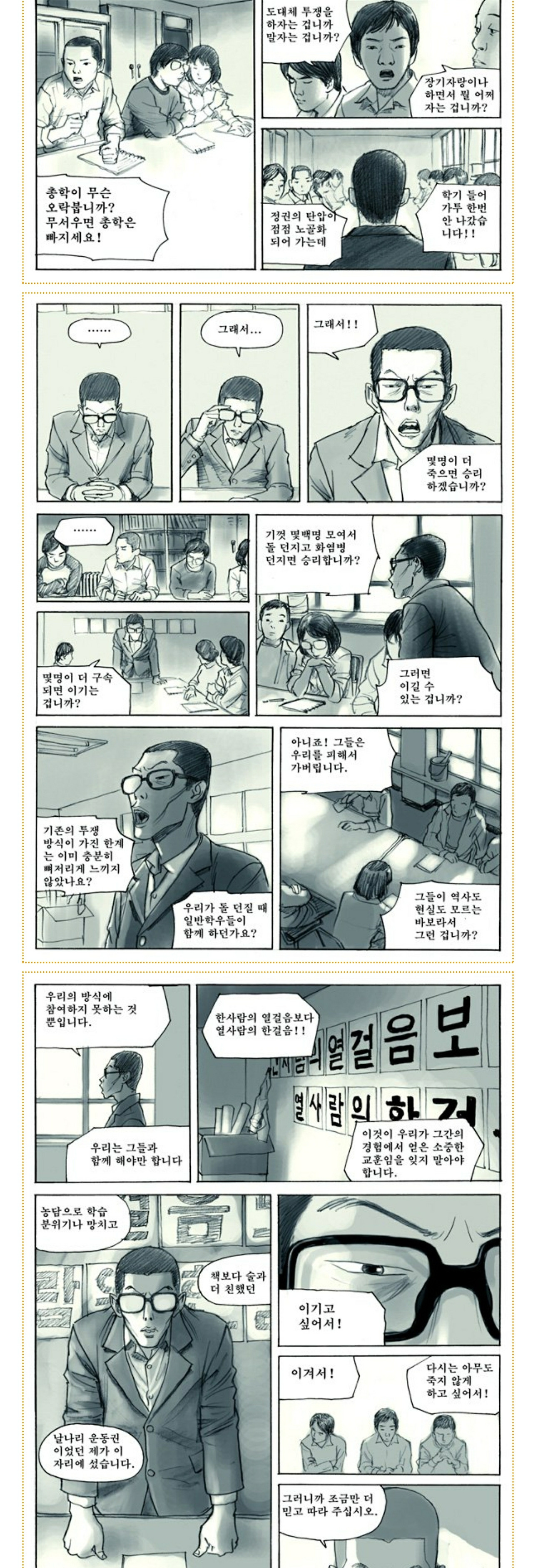 사회운동의 급진파냐 온건파냐 기동전이냐 진지전이냐 둘 중의 무엇이 더 무조건 옳냐는 논쟁은 사실 무의미할 것이다. 다만 현실에서 한쪽의 투쟁 방법이 지금 한계에 부딪쳤다면 다른 방법을 찾는 지성의 유연함이 모든 사회운동에 필수적이지 않을까. 이 만화에 나오는 총학생회장은 분명 책보다 술이 더 친한 날라리 운동권이었지만 바로 그런 사람이 대표자이기에 군사정권의 치하에서 유연할 수도 있으리라. 한 사람의 열 걸음보다 열 사람의 한 걸음을 위해 절대 선제 폭력이 아닌 주장의 순수성으로 평화 시위를 하자는 이 집회에 드디어 평범한 시민들도 공감하고 동참해주기 시작한다.