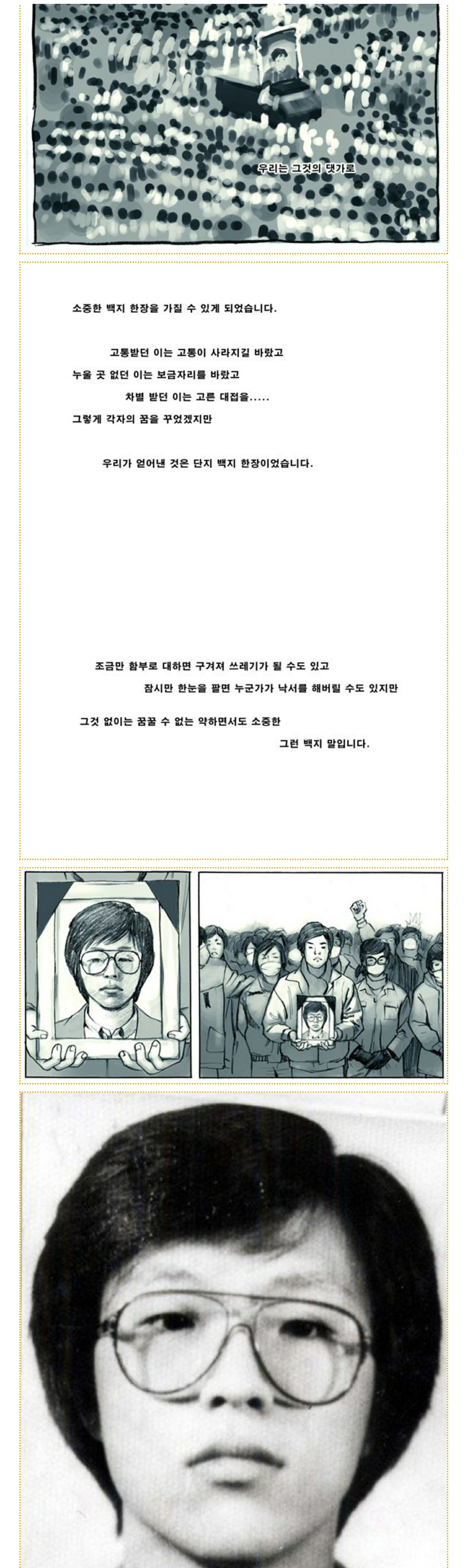 우리가 다들 알다시피 이런 투쟁과 박종철 이한열 열사같은 분들의 희생을 거쳐 체육관에서 군인들이 총 들고 거수로 군인 대통령을 뽑던 우스꽝스러운 나라에서 겨우겨우 한 표 겨우 백지 한 장을 얻게 된다...