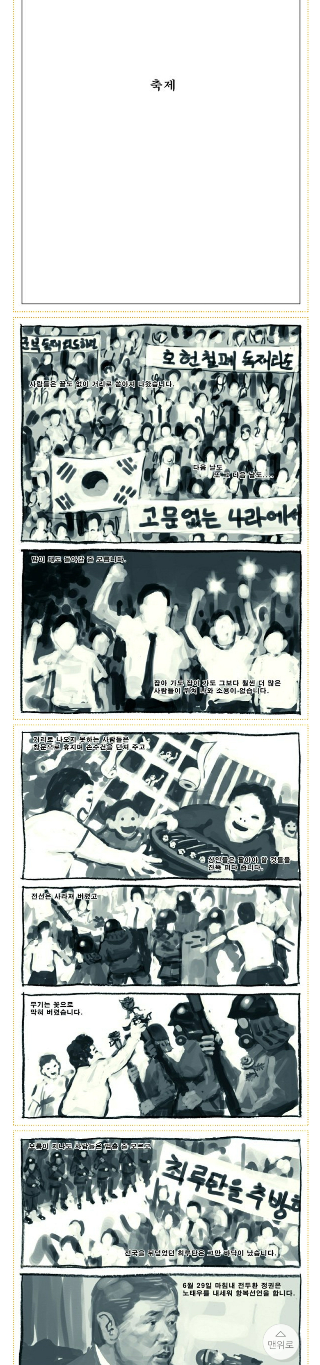이 백 도씨 마지막 에필로그의 이름은 축제. 호헌조치 철폐와 대통령 직선제라는 성과를 얻어낸 한국 80년대 시민사회는 지금 봐도 그 역동성과 단합력이 놀라우며 돌이켜보니 그 과정은 하나의 축제라고 봐도 무방하다. 하지만 다들 알고 있듯이 직선제 이후 김대중 김영상 양 김은 대통령 욕심에 분열하고 다시 한번 군사정권 노태우에게 자리를 내어준다...