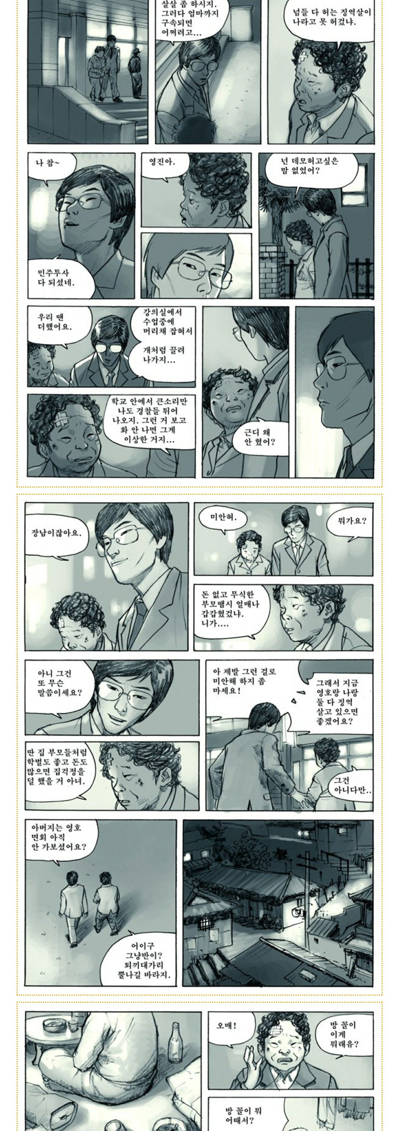 대학교에선 친구 선배들과 함께 새로운 진실들을 배워가지만 집에만 오면 그런 사회불온자와는 자기는 상관없다는 듯이 일종의 연기를 하는 영호. 선배가 지적하듯 그것은 하나의 위악, 거짓된 악함이다. 학생운동을 하자니 가족에 대한 책임감이 걸리고 안 하자니 양심에 찔리는 이 딜레마에서 그냥 나쁜 사람인척 모르는 일인 척 사는 건 아마 그 시절 대다수의 마음이리라. 그럼에도 하루는 다 같이 시위에 나갔다가 구치소에 영호가 수감되고 영호의 어머니는 아들을 석방하라며 외치다가 자신도 잡혀가게 된다.