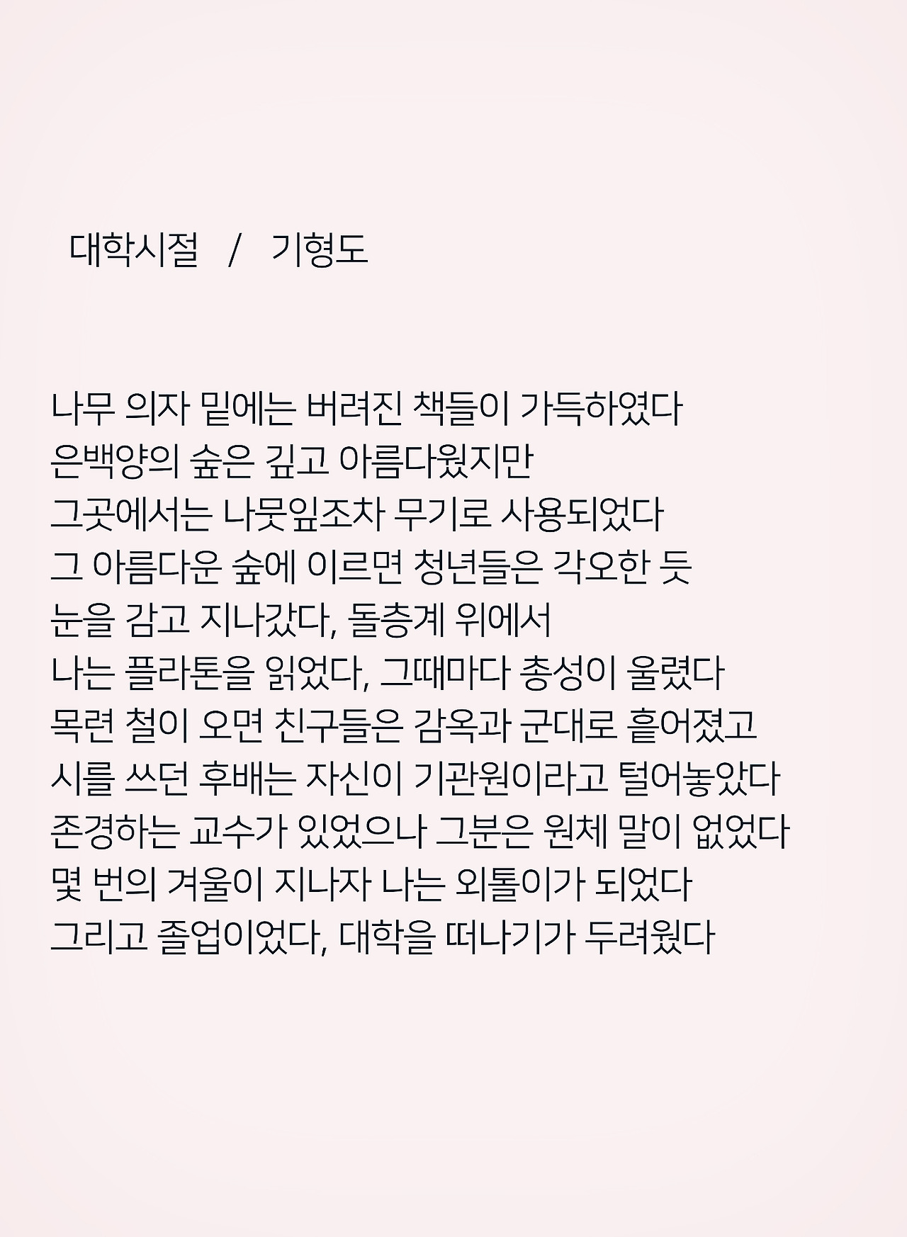 나뭇잎조차 무기로 사용되는 이 아름다운 숲의 돌층계에서 플라톤을 읽을 때마다 총성이 울린다. 마치 대부 같은 고전 누아르 영화나 사이버펑크 sf영화의 느리게 흐르는 클라이맥스 장면을 직접 몸으로 겪는 시인. 같이 시를 쓰던 후배는 자신이 국가의 비밀 스파이라고 털어놓고 존경하는 교수님은 이런 시대상을 다 아시지만 중립의 침묵이 굳건했던, 80년대. 겨울을 몇 번 버티자 외톨이가 되어버린다.