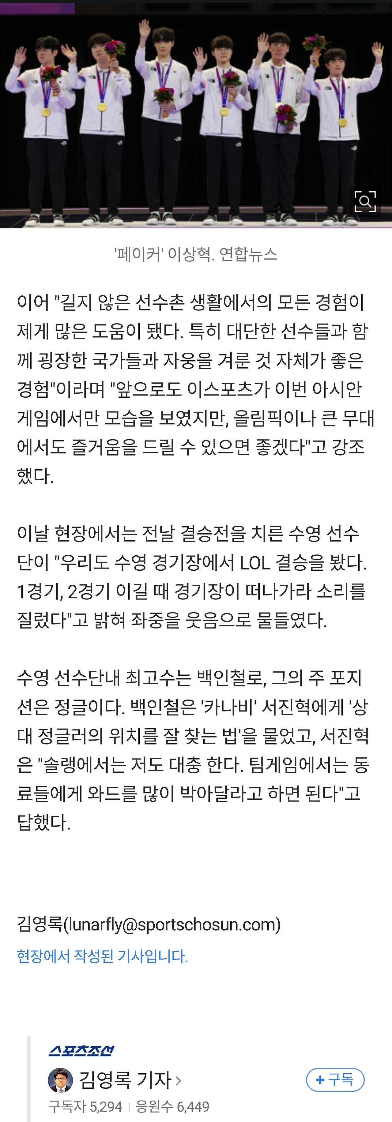 조금 늦었지만 먼저 축하부터 하는게 맞을 듯하다.한창 진행중인 항저우 아시안게임에서 4강에서 중국, 결승에서 대만을 깔끔하게 둘 다 2대0으로 잡은 LOL대한민국 대표팀이 롤 국제전 최초의 금메달리스트가 되었다. 주장 페이커 이상혁은 금메달을 받기 전부터 사실 아시안게임 최고의 셀럽이고 슈퍼스타였으나, 20년 넘게 E스포츠를 중계중인 리빙 레전드 전용준 캐스터님이 금메달 수여식후에 감격스런 마음으로 울먹거렸던 것은 결코 방송사고나 프로의식 부족이 아니다.