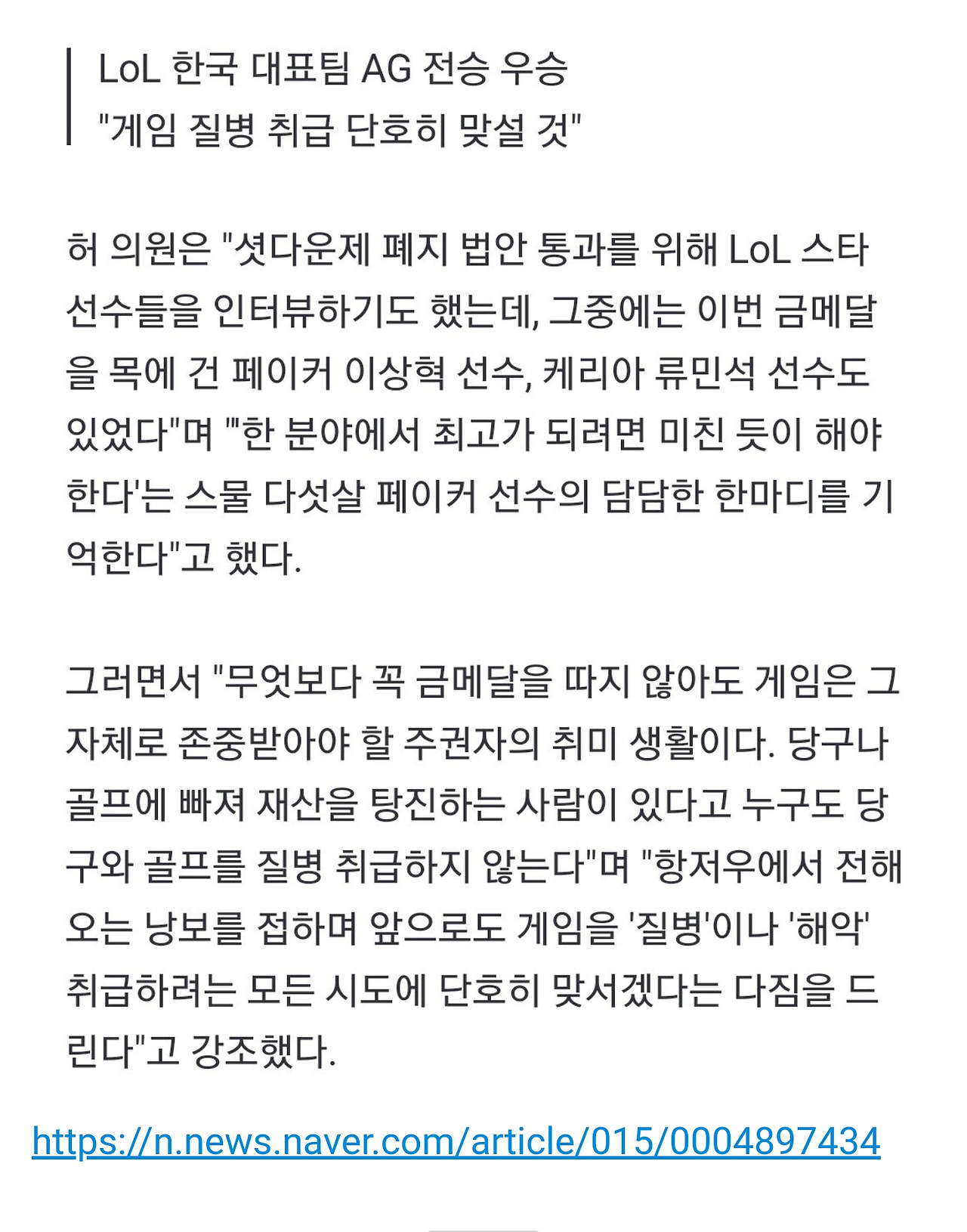 그 전용준 캐스터님의 그 울분은 이 뉴스의 허은아 의원의 말처럼 그저 게임을 하찮은 애들장난이나 심지어 질병으로 분류하려는 기성사회의 여전히 곱지않은 시선에 대한 마음과, 그 시선을 극복하고 기쁜 사자후를 토해내려다가 공적 방송인이기에 겨우 참아낸, 오히려 훌륭한 프로페셔널의 자세 그 자체라고 보는 것이 마땅할 것이다.그리고 마치 이에 상응하듯 주장 이상혁선수는 인터뷰에서 많은 곳에서 회자될 자신이 생각하는 스포츠에 대한 정의를 남겼다.