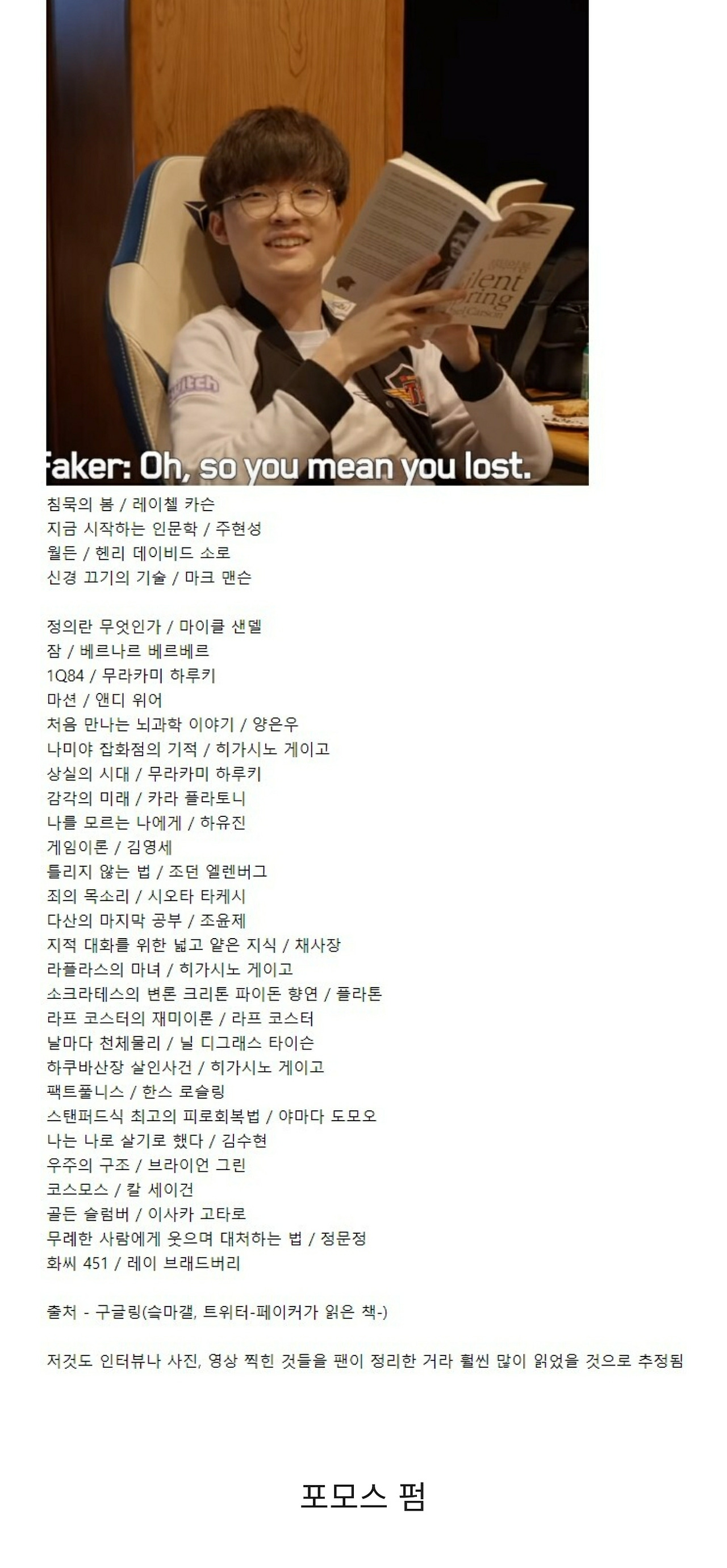 그런데, 평상시 하루에 10시간 이상의 시합 또는 연습과 광고촬영 등으로 바쁜 슈퍼스타 페이커는 어떻게 이런 난감할 수도 있는 민감한 인터뷰 질문에 똑 부러지게 답변할 수 있었을까? 혹시 감독이나 다른 사람이 미리 이렇게 답변하라고 예상 질의응답이라도 해본걸까? 아마 평소 페이커의 팬이라면 그런 의문에 쉽게 답할 수 있을 것이다. 조용한 성격의 INTP로 알려진 이상혁의 취미는 바로 여가를 독서로 보내는 것이고, 그가 자기가 사서 읽은 책을 종종 인스타 등을 통해 인증하는 것은 팬이라면 당연히 알고 있는 페이커의 습관 중 하나다.