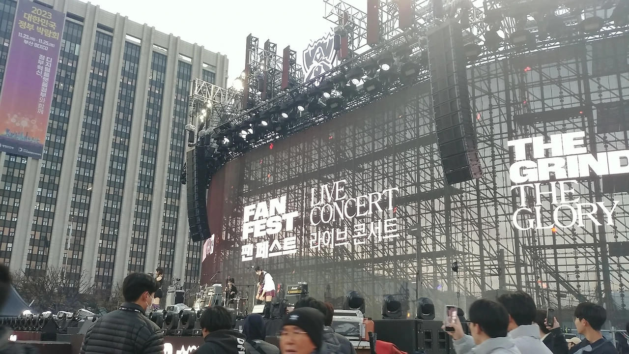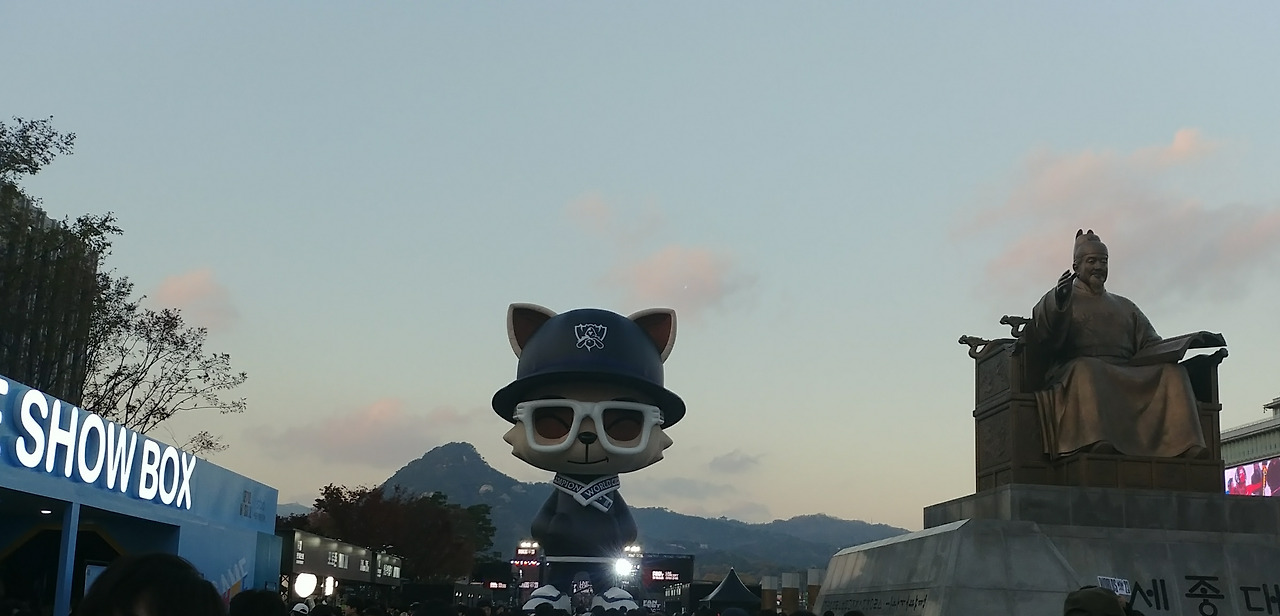결승전 하루 전날 롤드컵 팬 페스타를 한다길래 방문한 광화문. 낮인데도 체감 영하를 왔다갔다하는 추운 날씨에 난 고작 한시간동안 무슨무슨 부스에서 무슨 행사하는지 눈대중 구경만 하고 카페로 도망갔지만 그날분명 세종대왕과 티모 동상이 지켜보는 아래 만명은 우스운 내외국인 인파가 광화문에 몰려들었다.