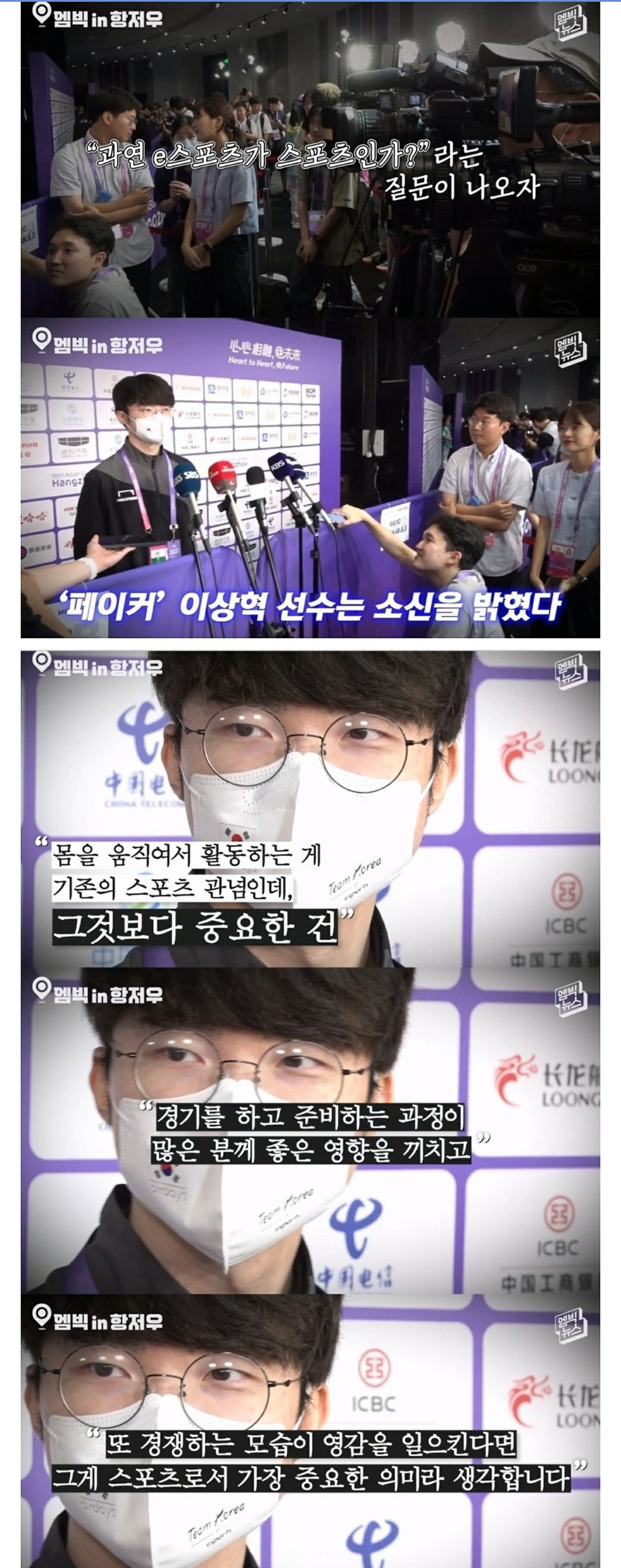 두 달쯤 전에 나는 아시안게임 롤 금메달을 따낸 롤 한국대표팀의 인터뷰에 대한 글을 쓴 적이 있다. 페이커가 스포츠란 기존 과거의 관념처럼 단순히 몸을 움직여서 뭔가 활동하는 것이 아니라 경기를 하고 준비하는 과정이 스포츠를 즐기고 응원하는 관객에게 기쁨과 영감을 주는 것이라 생각한다는, 질문한 기자의 의표를 찌른듯한 그 인터뷰.