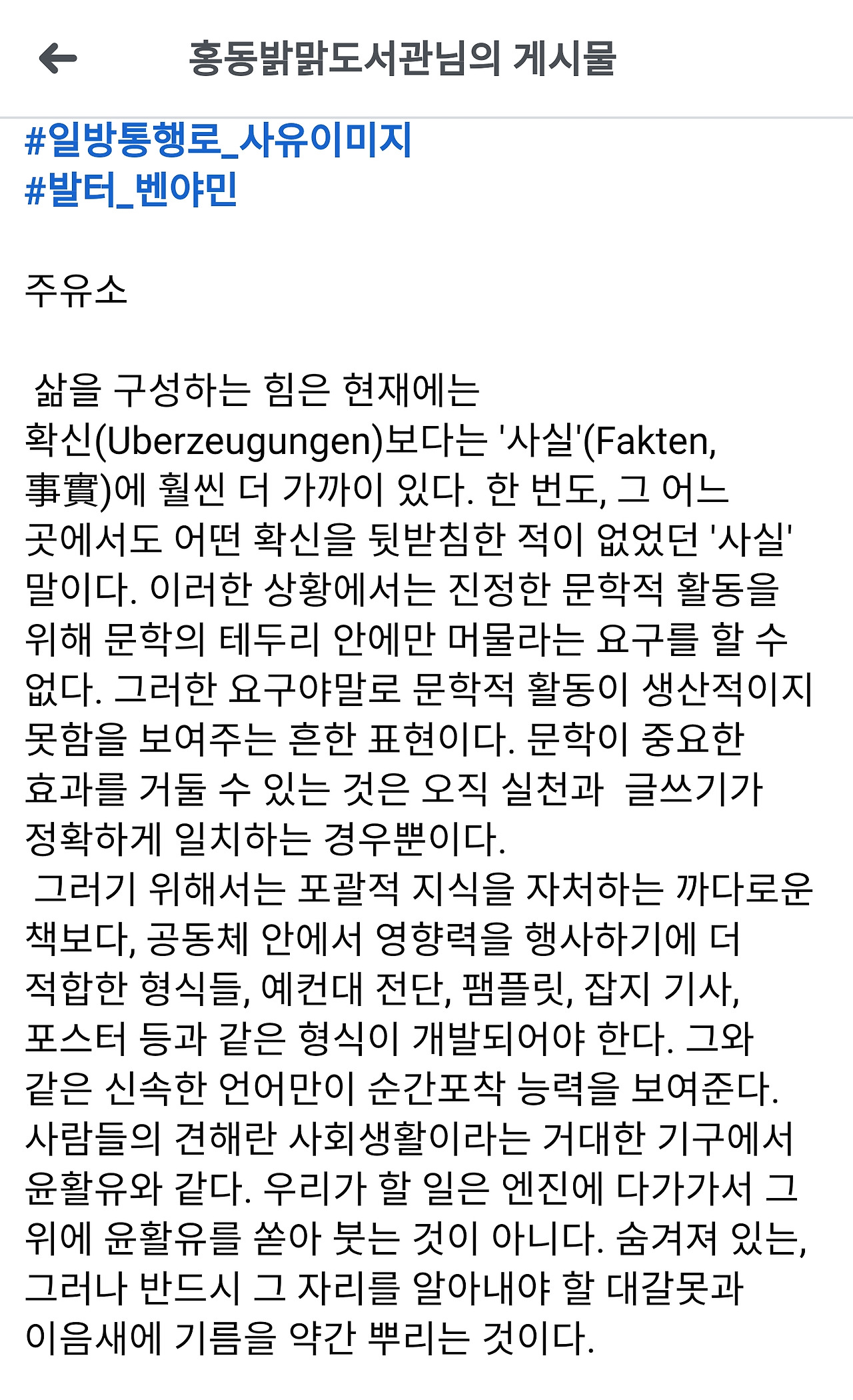 이런 신속한 짧은 글이 엔진, 즉 사회의 핵심 중심부가 아니라 숨겨져 있는 대갈못과 이음새에 기름을 뿌리는 일이라고 강조하는 벤야민처럼 그저 글 하나로 세상을 디 바꾼다고 무리한 욕심 또는 망상에 시달릴 필요는 없고 그런 시대는 지나간 지 오래되었다. 지금 시대의 글쟁이는 그저 별것 아닌듯이 숨겨져 있지만 사실은 핵심 엔진만큼이나 사회를 돌아가게 하는, 사소한 주변을 윤활시키는 조그만 글과 기록을 계속 남기고 연습해야 한다... 그리고 그런 연습을 계속하는 사람만이 결국 정말로 한 분야에서 조금 더 나아간다...