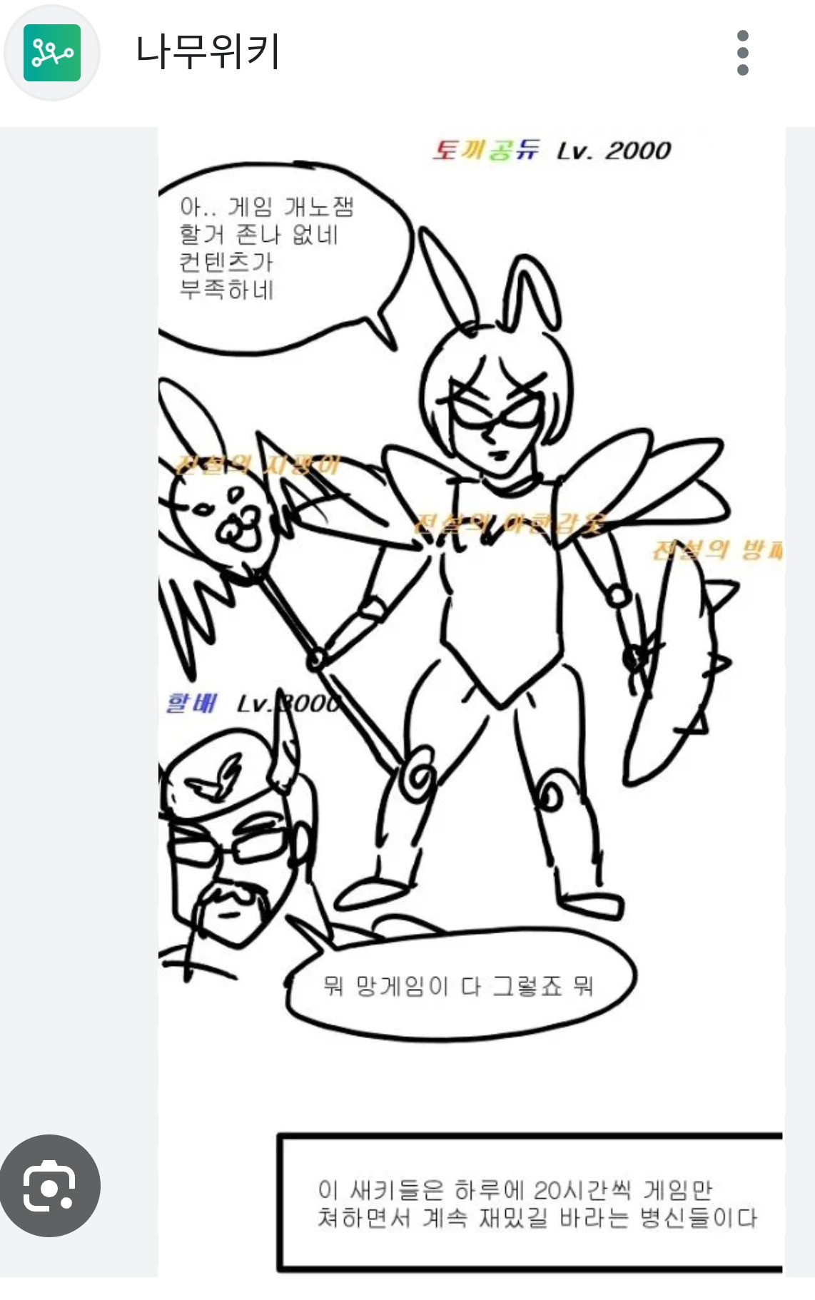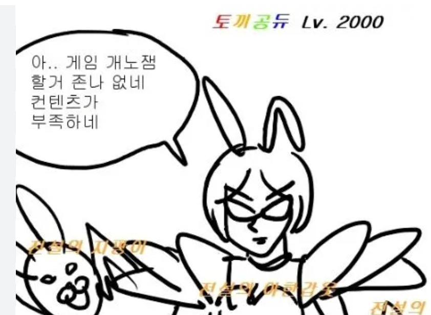 토끼공듀라는 이름으로 널리 퍼진 전설의 그림. 정말 옛날부터 이 그림을 본 기억이 나는데 위키에 찾아보니 2014년 제작이란다 어느새 10년. 강산이 변할 정도의 시간이 흘렀지만 툭하면 온라인 게임 커뮤니티에 주기적으로 올라오는 짤이다. 매일매일 휙휙 빠르게 트렌드가 변하는 인터넷세상의 흐름을 생각하면 10년 동안 계속 상기되는 이 그림은, 수백만 장의 짤방이 흘러넘치는 한국 온라인 게임계에서만큼은 '고전' 클래식의 지위에 있다고 봐도 되지 않을까.