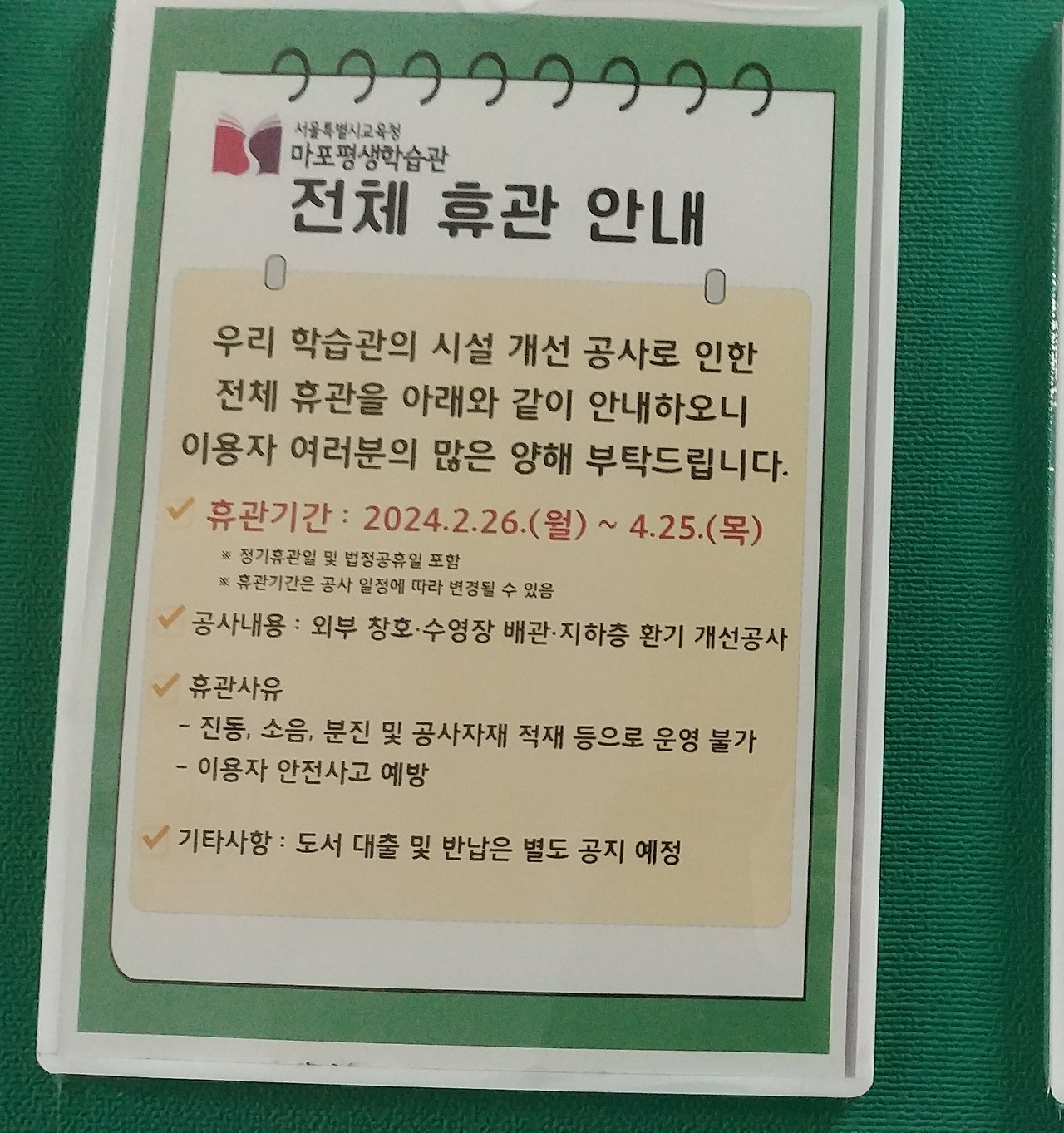 일요일 휴일은 대다수의 공공기관이 문을 닫지만 그중 예외로 도서관 가기엔 좋은 날이다.그래서 일욜마다 홍대 언니네 카페와 마포평생학습관을 들리는 일이 나의 주된 힐링 일정이었지만, 아쉽게도 내부 공사로 두 달간 휴관이라는 공지...
