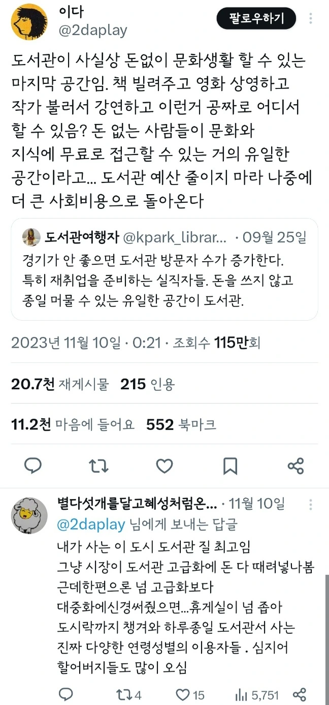 나의 소중한 쉼터가 2, 3주도 아니고 무려 8주간 쉬어버린다니... 나의 주된 도파민 충전소인 프리미어리그 토트넘의 주장 손흥민이 8주 부상 뉴스가 뜬것만 같은 충격과 아쉬움. 이제 한동안 일요일에 뭘 해야 하나 방구석에서 방황하는 와중에 예전에 스크린샷을 저장해 둔 도서관에 대한 트윗을 다시 찾아냈다.