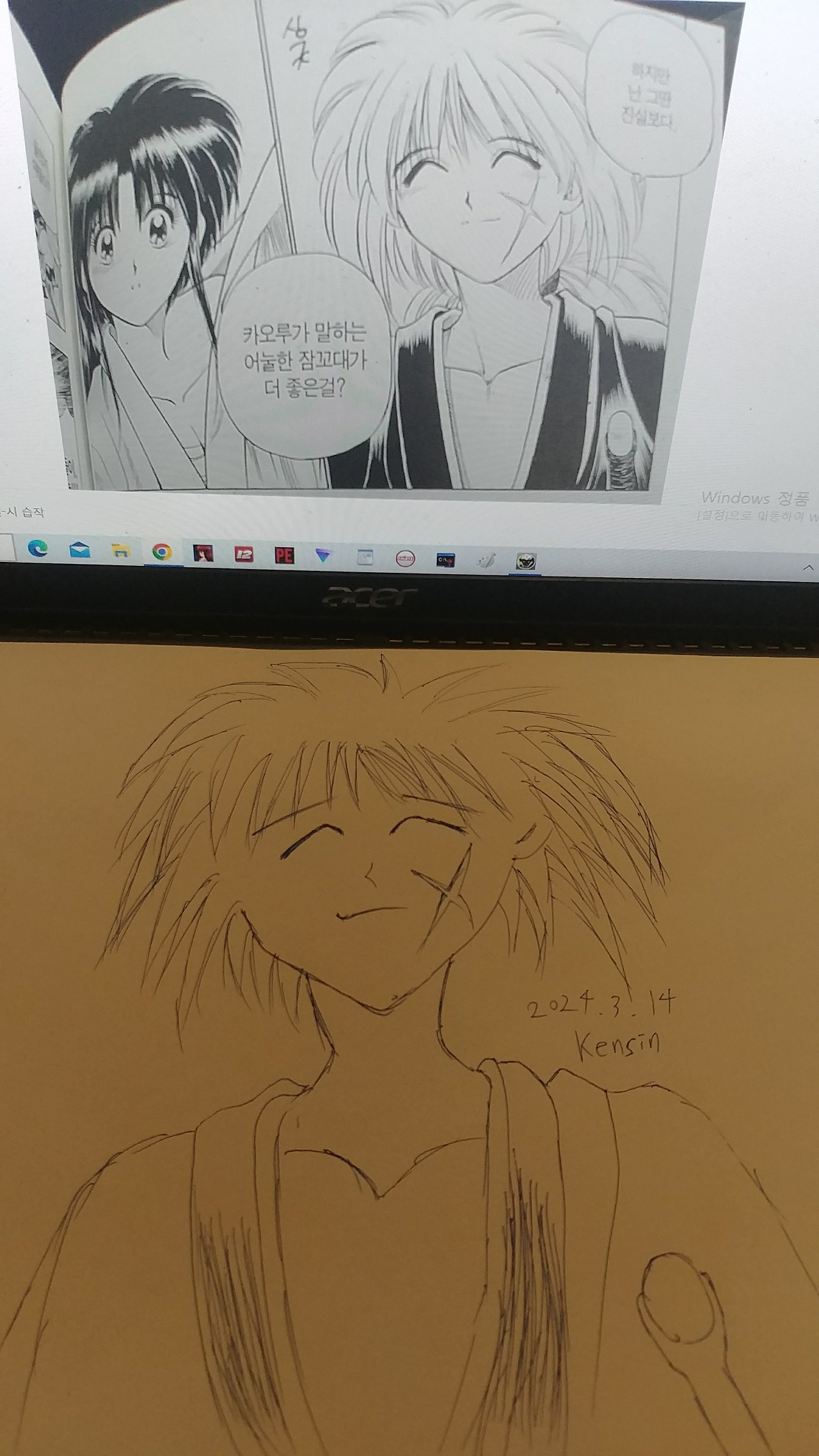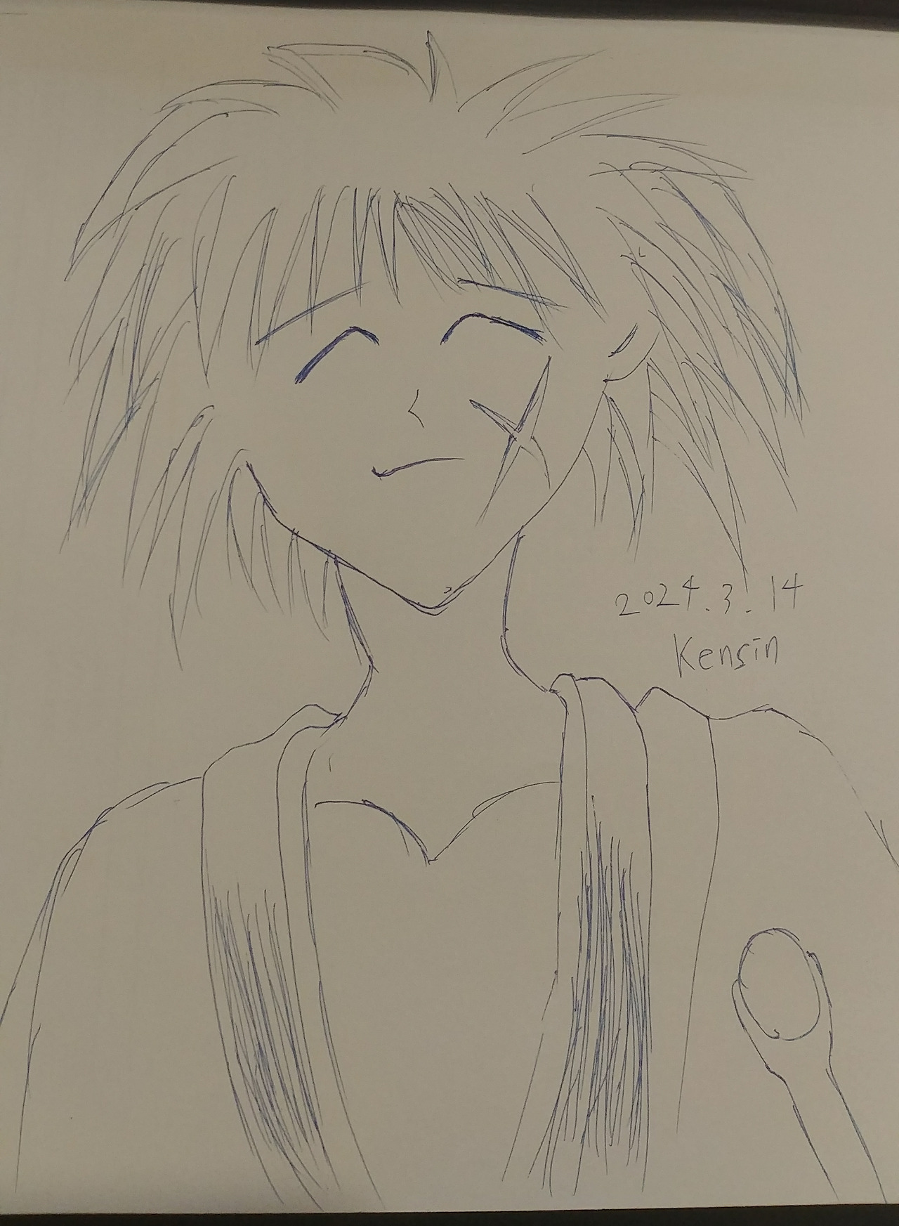 어제 글에서 바람의검심 주인공이 웃으면서 말한 세상의 진실보다 잠꼬대가 더 좋다는 말이 계속 생각나서 따라 그려본다.