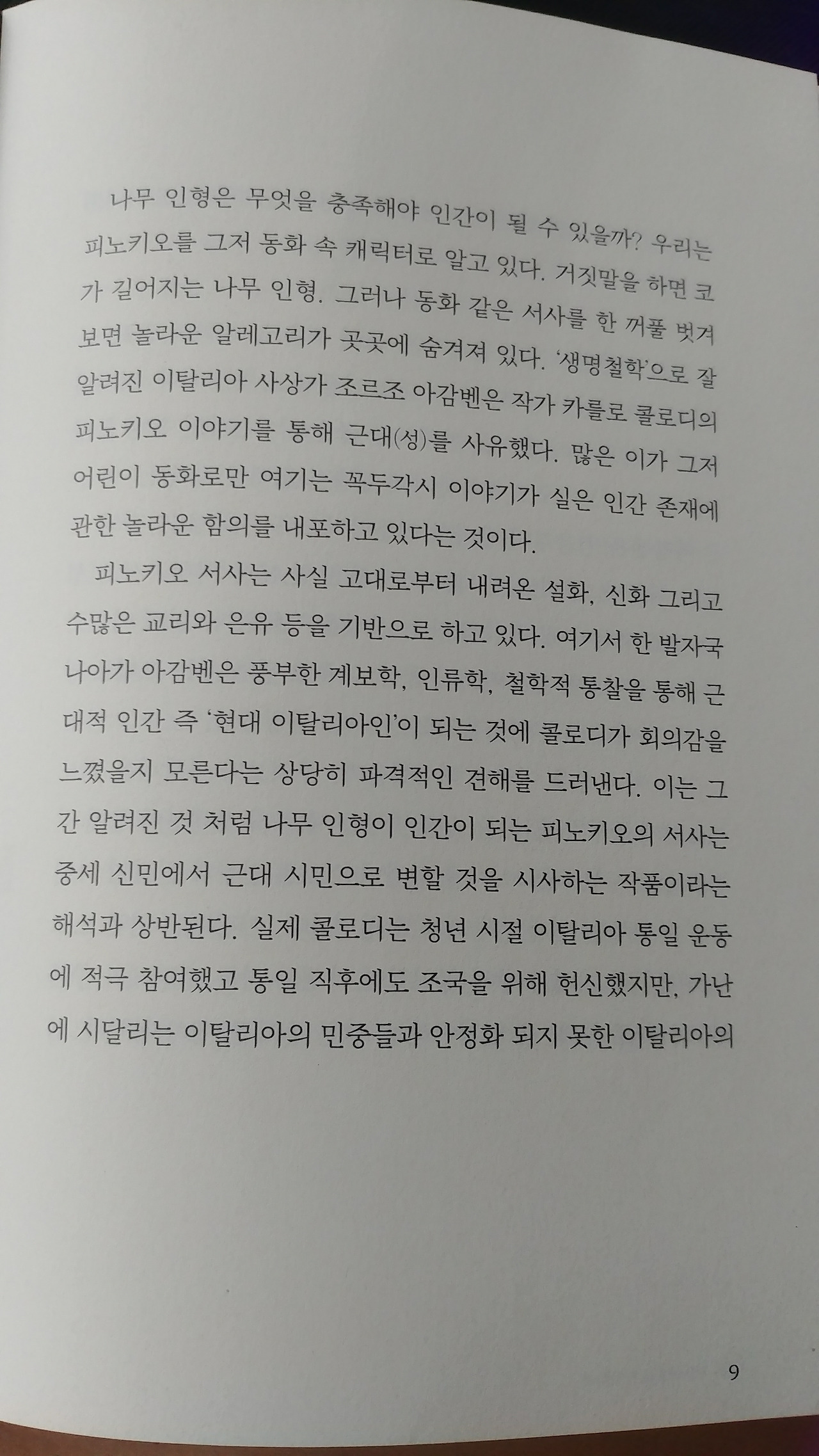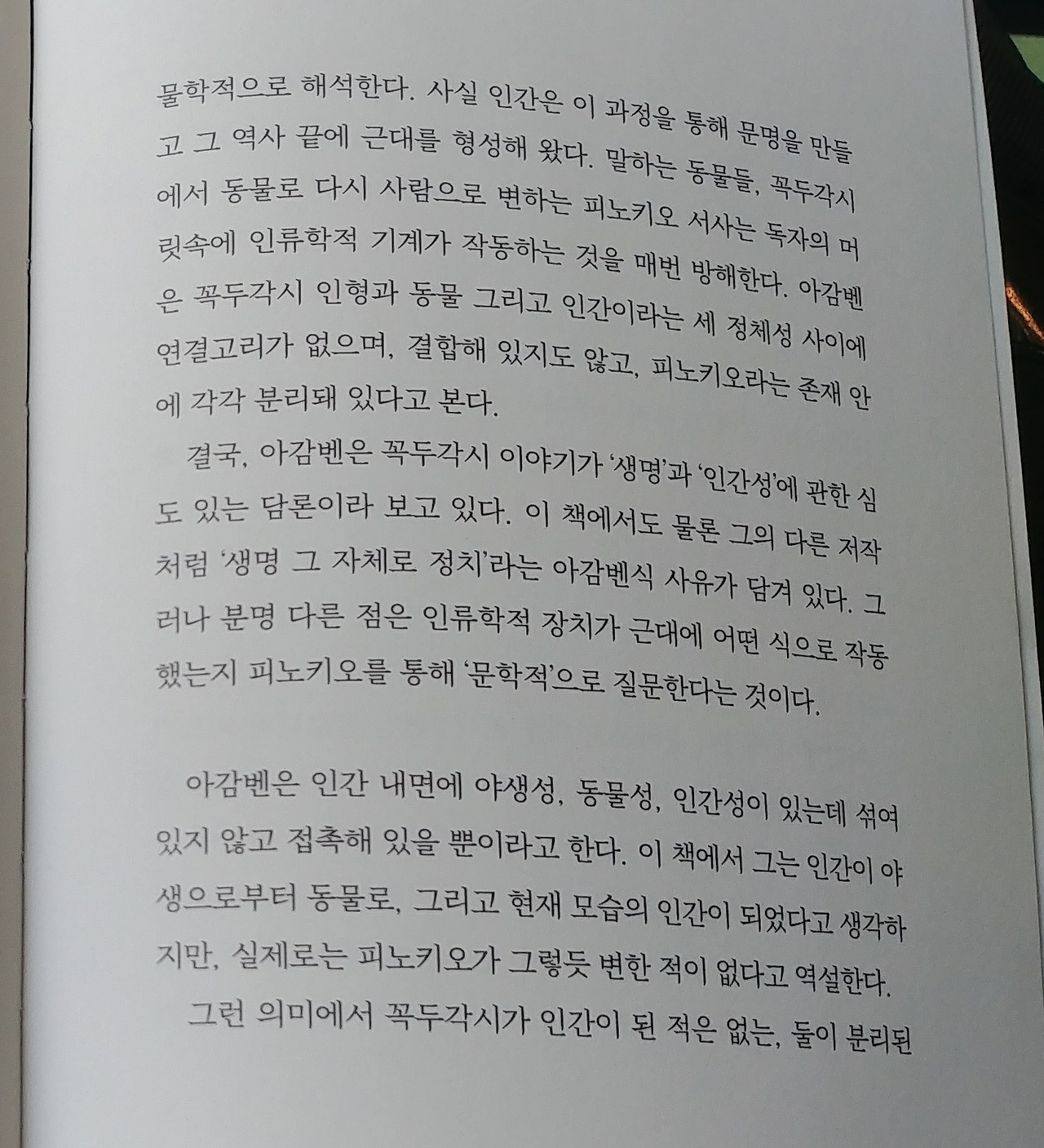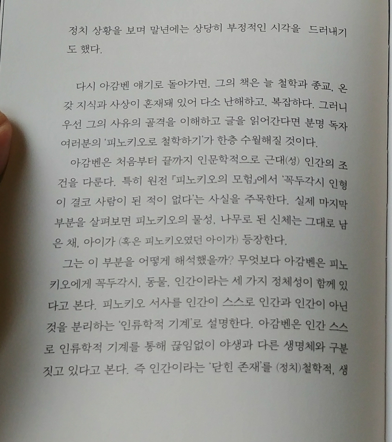 호모 사케르니 벌거벗은 생명이니 하는 그의 철학적 개념들은 한국 인문학계에서도 한때 꽤 난해하지만 좀 배운 사람들이라면 즐겨쓰는 철학적 유행이었지만, 이 책은 이전 책들의 그런 개념들과는 상관없이 우리가 동화와 디즈니의 애니로 익히 알고 있는 피노키오에 대한 해설과 우화에 대한 고찰로 흥미롭게 접근한다.
