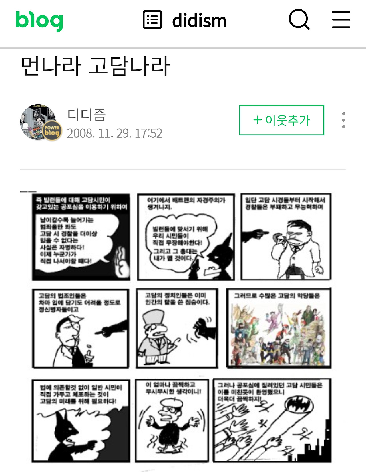 마피아와 결탁한 고담 시티의 경찰, 검사, 정치인 등등은 도저히 믿을 수 없으니 더 이상 법과 공권력에 기대지 말고 스스로 무장해서 자신과 도시를 지키라고 선동하는 배트맨. 이 그림을 하나하나 그린 정성어린 패러디가 재밌는 점은 물론 작가마다 배트맨에 대한 해석은 다를 수 있지만 놀란 감독의 다크나이트 트릴로지로도 유명한 일반적인 배트맨 해석과는 달라지기에, 이 짤방 자체가 원본처럼 비판의 여지가 충분하다는 것이다. 어쩌면 원본의 문제점을 알기에 패러디도 그걸 노린 걸지도.