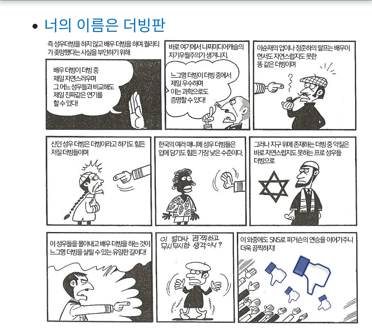 이 너의 이름은 더빙편 패러디는 배트맨 편과는 달리 원본 그림을 거의 손대지 않고 거의 대사만 바꾸었다. 그럼에도 불구하고 한국어 더빙에 전문성도 경험도 부족한 배우를 기용해서 흥행이 망해버린 너의 이름은 더빙판을 비판하는 게 물 흐르듯 매우 자연스럽고 적합하다. 그 이유는 아마 원본 자체의 만화적 구도 프레이밍이 워낙 우수하기 때문이 아닐까. 이순재의 업이나 주먹왕 랄프의 정준하 더빙은 배우 더빙인데도 이쪽 경험이 풍부하기에 굉장히 성공적인 더빙으로 평가되며, 한국 프로 성우들의 실력은 말할 나위없이 세계적이다. 원신같이 지금 세계적으로 흥행 중이며 수십 개의 언어 더빙을 제공하는 글로벌 게임을 다른 문화권 게이머들이 한국어 더빙이 일본어 못지않게 자연스럽고 멋지기에 불만족스러운 자국 언어 더빙보다 오히려 한국어 더빙을 택하는 국뽕스러운 영상을 유튜브에서 쉽게 찾을 수 있듯이.
