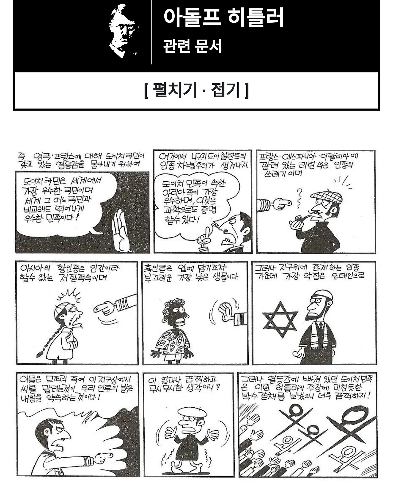 지난 글에서 말했듯이 먼나라 이웃나라 구판은 역사만화의 선구자였지만, 80년대에 작가 개인의 유학생활 지식에 기반한 만화이기에 수많은 자잘한 역사적 오류와 연출적 과장 축소가 들어가 있다. 그 중에서도 가장 유명한 장면은 역시 도이칠란드 독일 편에서 히틀러의 인종차별에 대한 부분이리라.