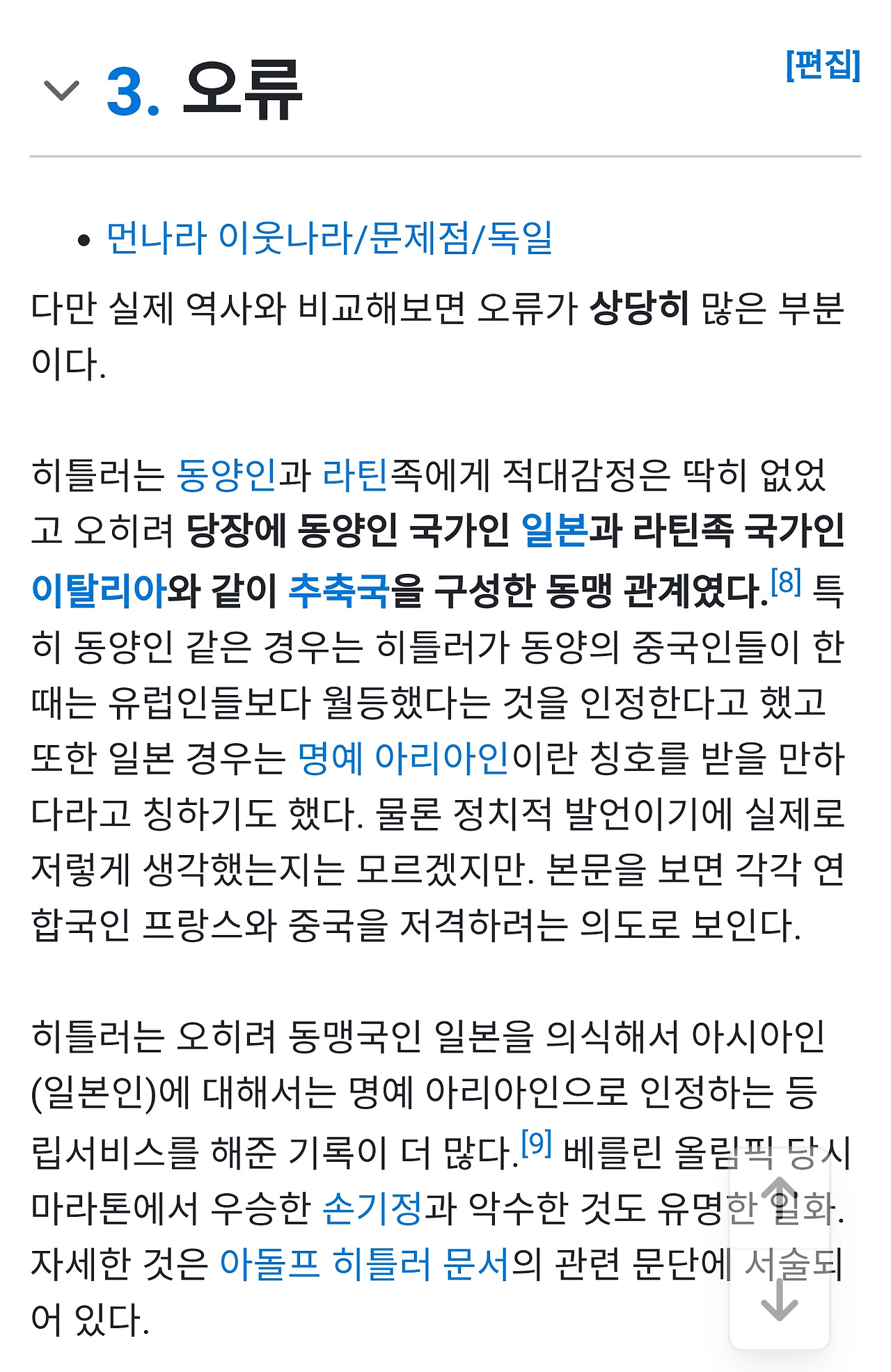 한국인 입장에서만 생각해봐도 2차 대전 일제강점기 당시 마라톤에 출전한 손기정 옹이 우승하자 히틀러가 직접 금메달을 수여하며 그대 지상에서 가장 위대한 자 라며 상찬했다는 이야기는 상식 수준으로 굉장히 유명하지 않나? 히틀러가 동양인은 다 죽이려는 극단적 인종차별자인데 올림픽이니까 연기라도 한 걸까?그리고 동양인 국가인 일본과 라틴계 인종이 많이 사는 이탈리아가 독일과 함께 2차 대전 동맹 전범국이라는 것도 세계사 시간에 졸지 않았다면 너무나 당연히 알고 있는 사항이다.