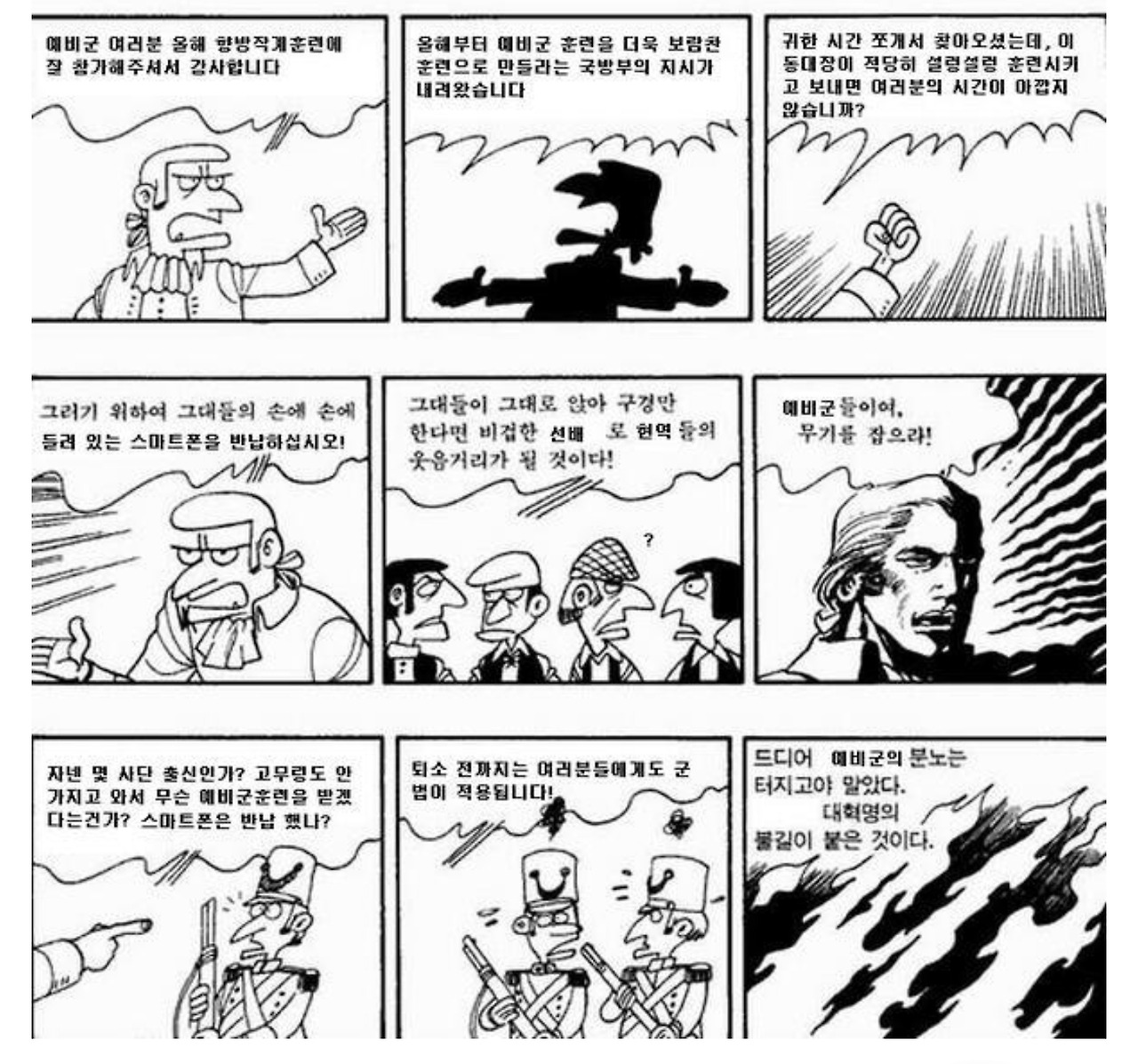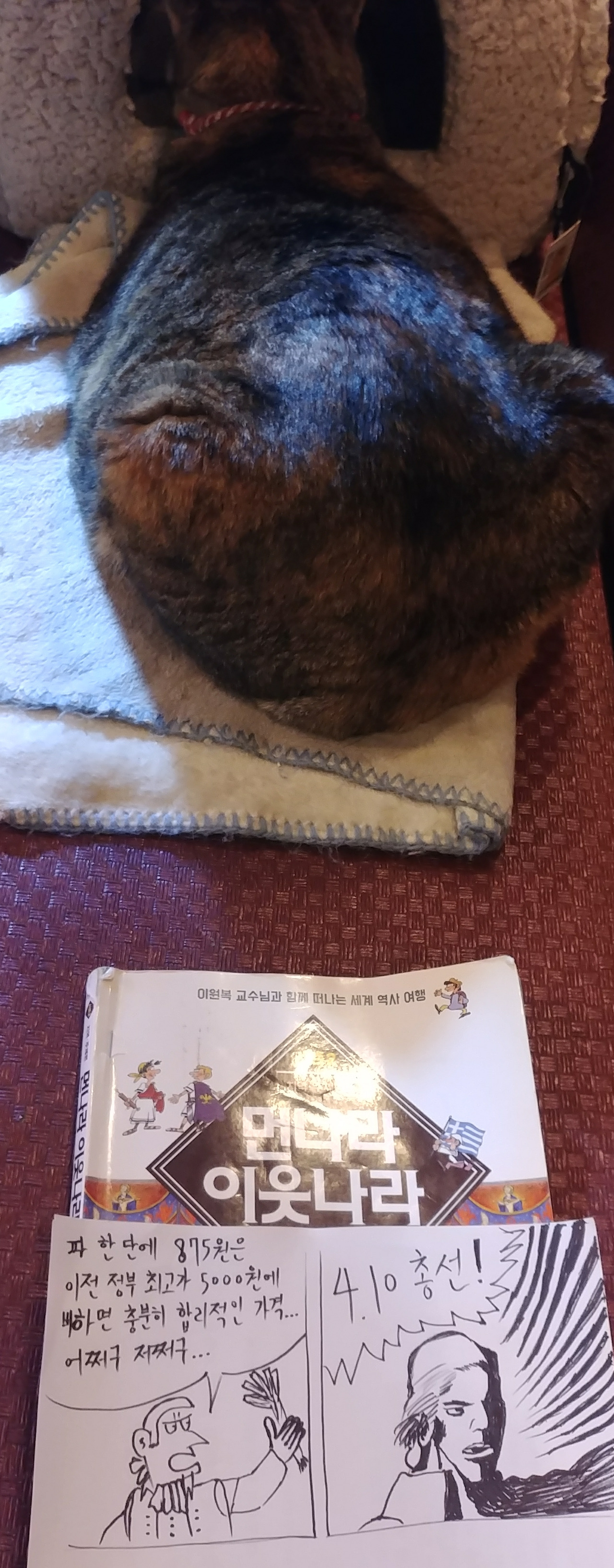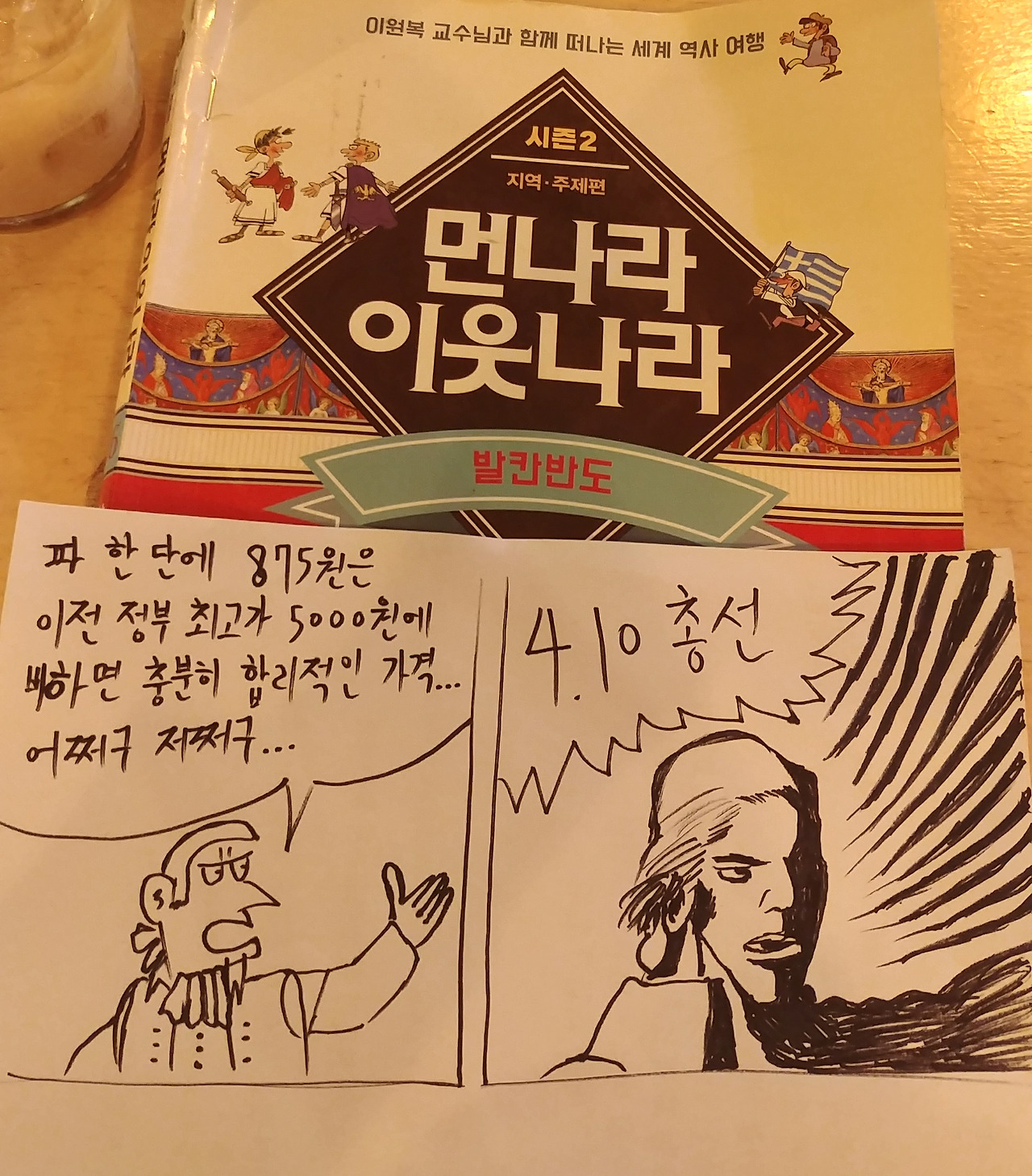 지금 다시 봐도 저 로베스피에르의 간단한 데포르메 그림에서 극화체로 확 바뀌며 혁명 봉기를 선동하는 장면은 정말 모범적인 드라마틱한 만화의 구도다. 그렇기에 저번 글에서 소개한 히틀러의 인종차별 씬 못지않게 많은 정치쪽 이슈에서 패러디를 재생산했다. 요새 다른 뉴스도 많지만 총선 선거철이라 그런지 파 한 단 875원에 대한 후속 뉴스가 꼬리에 꼬리를 물고 나를 열받게 만들기에 카페에서 쉬다가 한번 휙 그려보았다