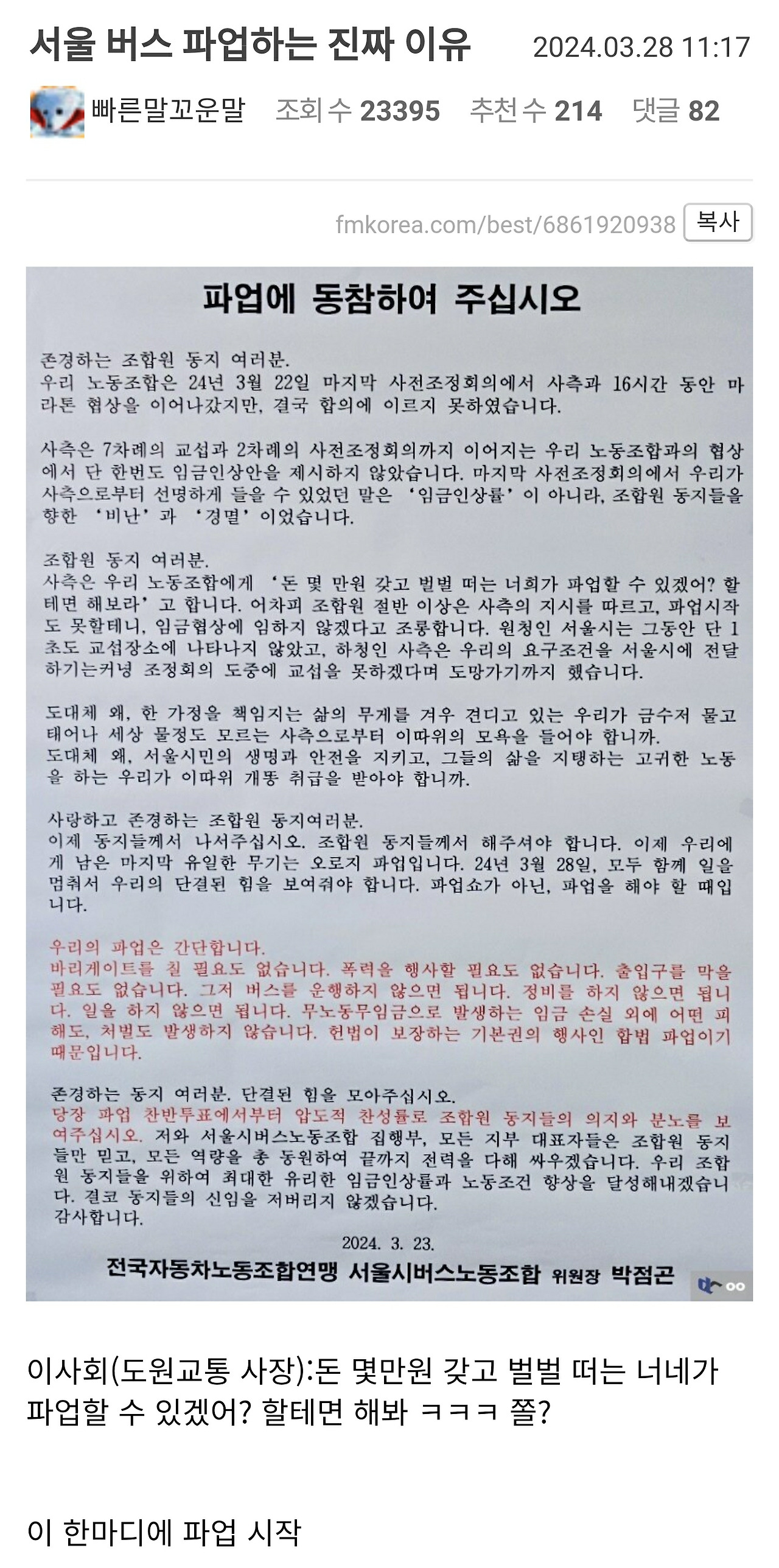 7차례의 교섭과 마지막 16시간의 마라톤 협상 회의에서조차 단 한 번도 임금인상을 제시하지 않았다는 사측. 버스 원청인 서울시는 그동안 단 1초도 교섭장소에 나타나지조차 않았으며 사측은 심지어 돈 몇만 원에 벌벌떠는 너희들이 무슨 파업을 하겠냐고 조롱과 경멸을 던진다. 사측 저들도 분명 나와 같은 인간일 텐데... 더욱 인간이 미워진다. 일반화의 오류니 뭐니 다 쓸데없다.