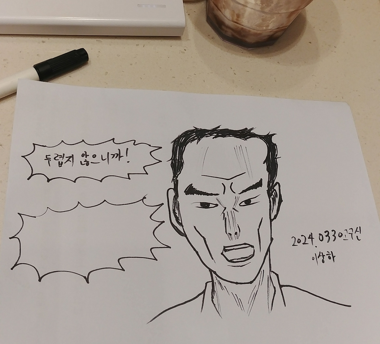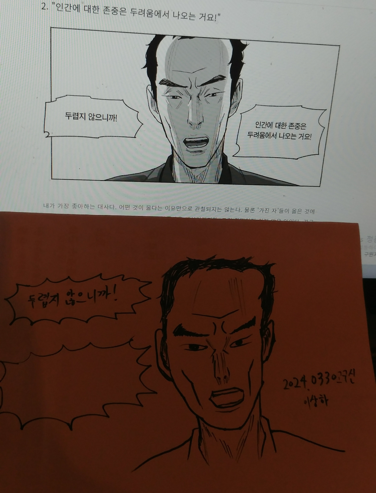 잘 벼린 칼날처럼 날카롭지만 종종 블랙 코미디를 연출하면서 인간 냄새나는 반전매력을 보여주는 송곳의 고구신. 그의 날카로운 매력을 담아내는 대표적인 명대사, 두렵지 않으니까! 인간에 대한 존중은 두려움에서 나오는 거요! 를 생각하며 펜으로 살살 모작해 보았다. 원작의 한겨울에 파르라니 깎아낸 칼 정도까진 아니지만 그래도 내 똥손치고는 나름 만족스럽다