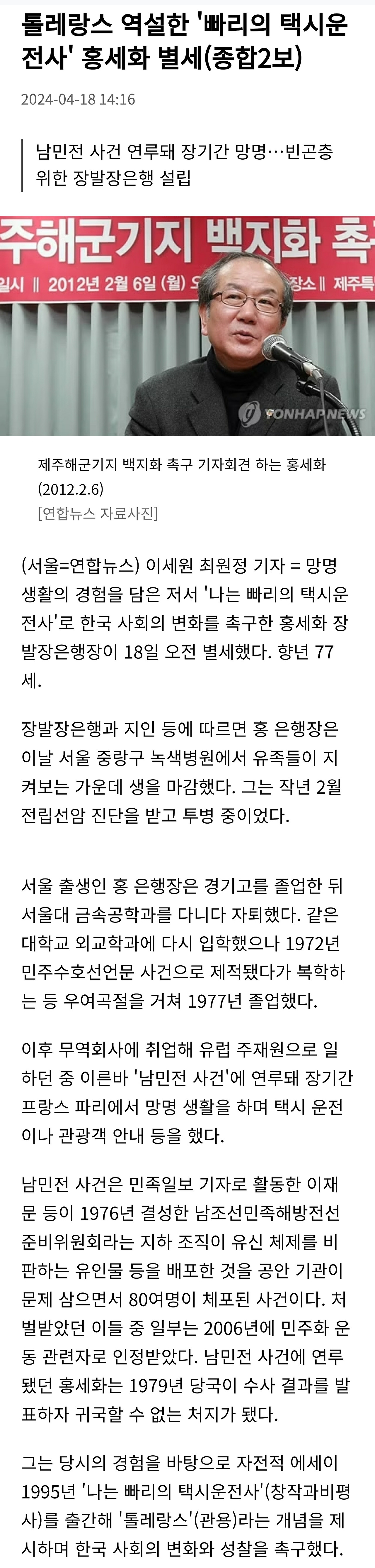 처음에는 마지막 인사라길래 아 녹색정의당의 심상정처럼 노동당의 홍세화 어르신도 이제 정계 은퇴를 하는건가 싶었다. 떠밀리다시피 진보신당 대표를 맡다가 스타 정치인 없이 노동당을 지키고, 이번 총선에서 진보정당들의 초라한 성적표를 보시니 이제 그만 공식적으로 은퇴하시고 푹 쉬실 만도 하지 생각하며 신문을 폈는데... 은퇴가 아니라 부고. 별세하셨다는 뉴스였다.