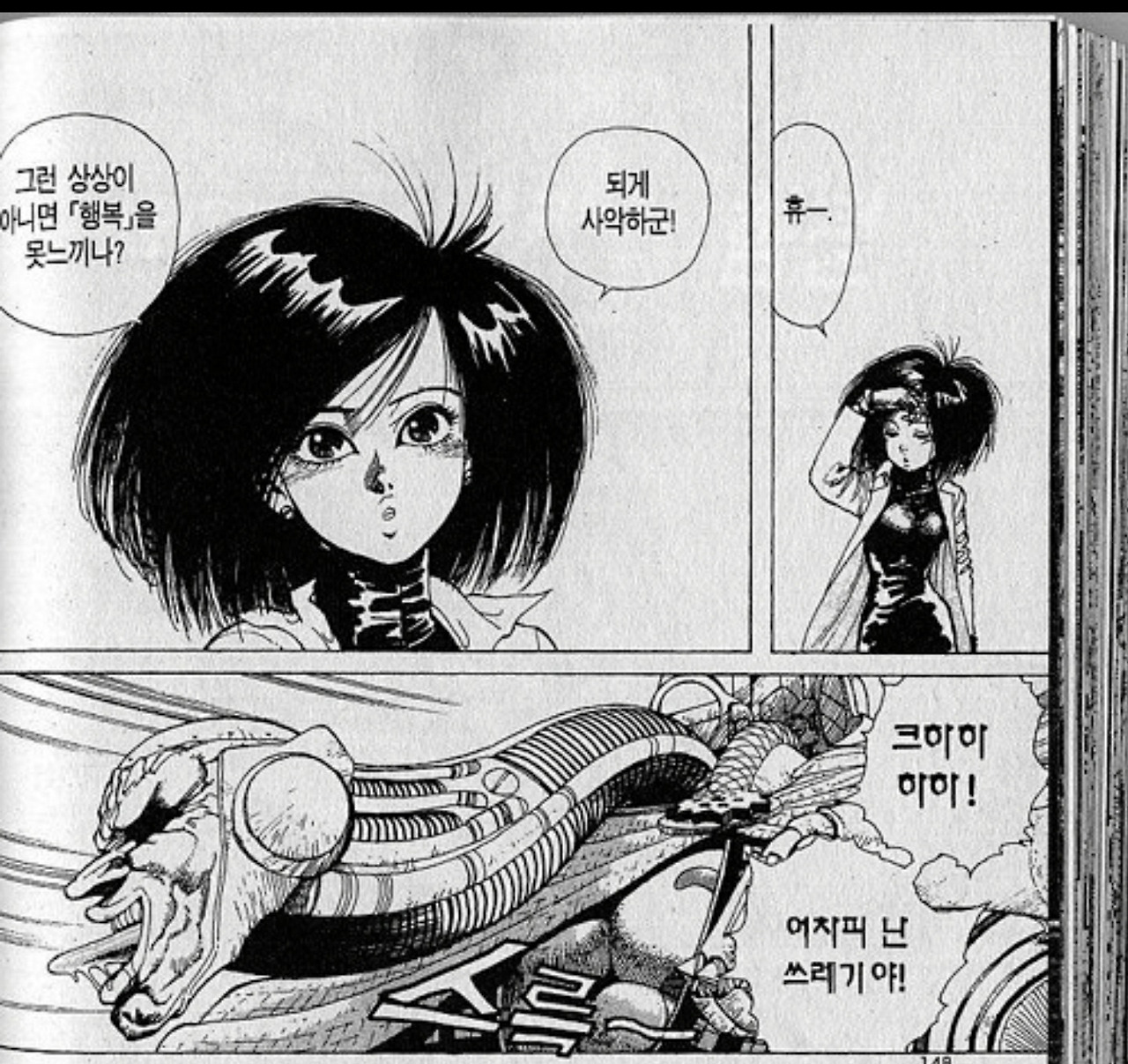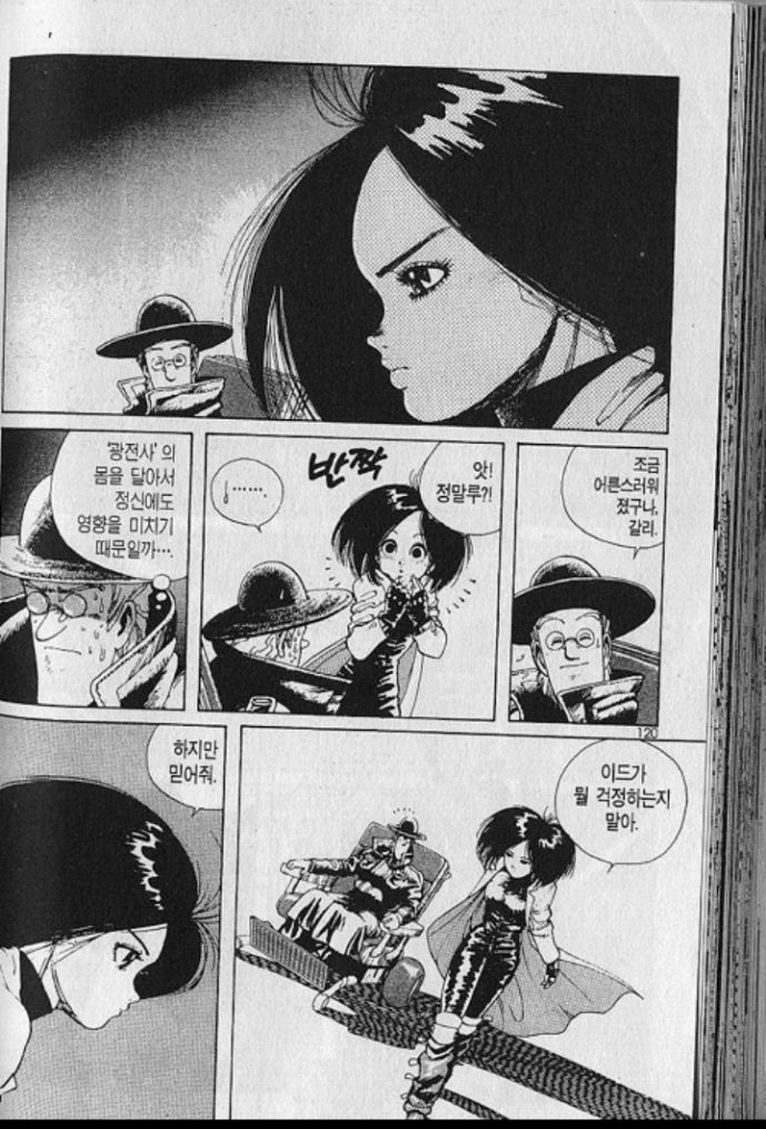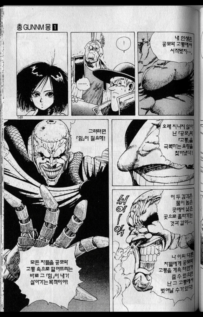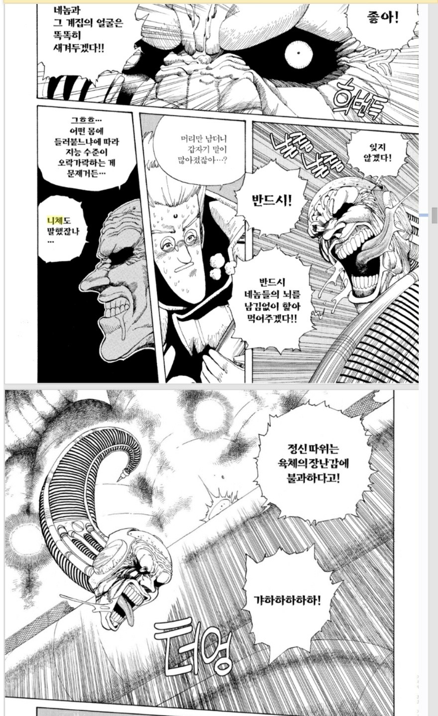 이런 니체의 철학, 신체야말로 머리의 이성보다 커다란 이성이라는 사유는, 얼마전 제임스 카메론에 의해서 배틀엔젤 알리타라는 영화로도 제작된, SF만화의 명작인 총몽에 스며들어 있는 핵심적인 철학이다. 여기서부터는 늘 그렇듯 당연히 총몽 만화판에 대한 스포일러가 있으니 아직 보지 않으신 분은 총몽 1권 2권을 보고 오시길 권한다. 어제 리뷰한 망작 영화 다크피닉스 따위와는 비교할 수 없는 총몽은 이미 만화계의 고전으로, 시간 투자를 하셔도 아깝지 않을 것이다. 이 총몽에서 이드에 의해 구조된 주인공 갈리(알리타)가 사실상 처음으로 만나는 빌런이라 볼 수 있는, 마치 마약 중독처럼 뇌수의 엔돌핀에 중독된 마카쿠는 대놓고 니체를 인용하면서 다음의 대사를 이드와 갈리에게 던진다.