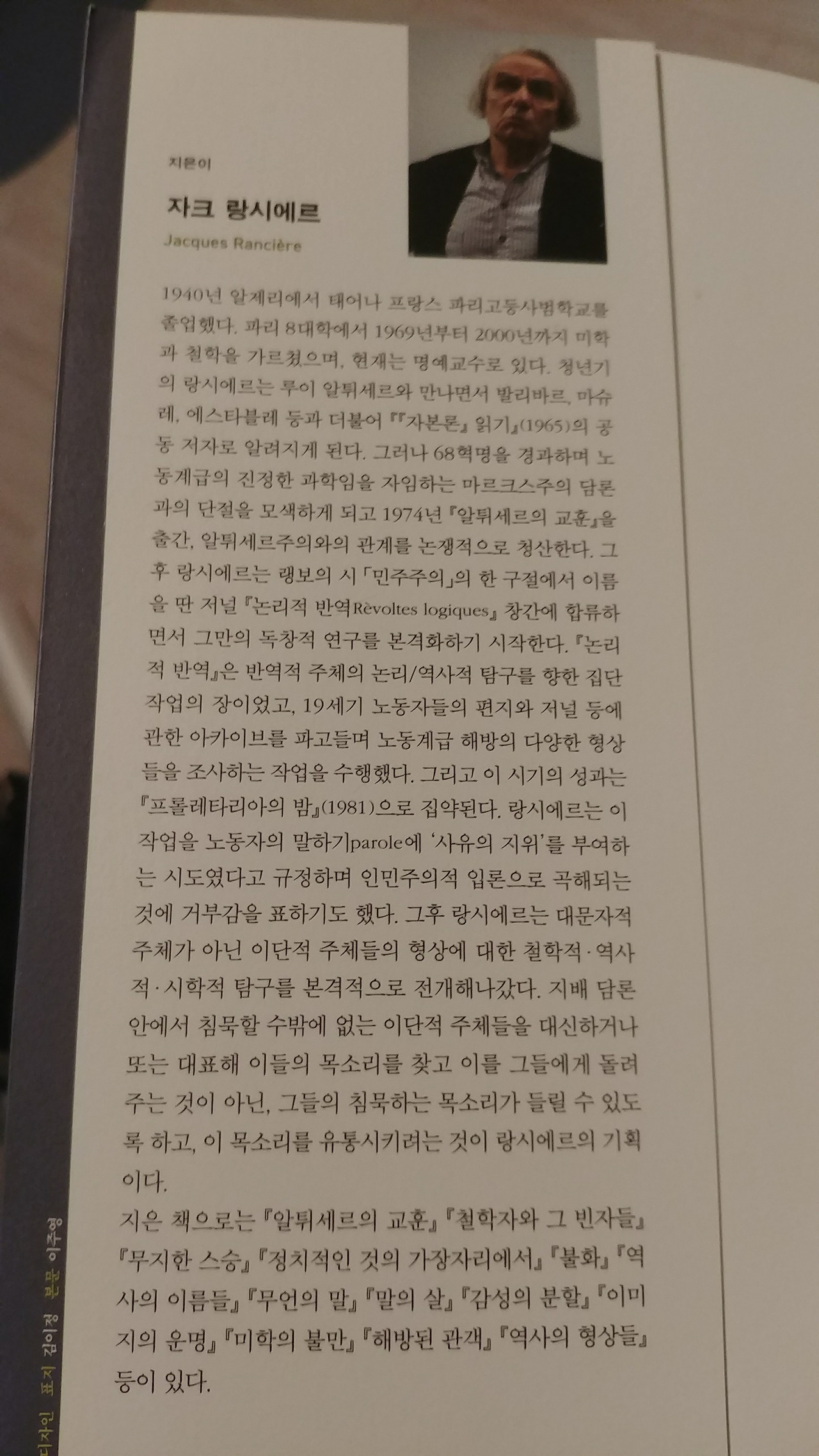 물론 그렇다고 해서 랑시에르의 이 책이 철학적으로 부족하다느니 논리적 완결성이 없다느니 그런 비판을 할 요지가 결코 아니다. 다만 한국 철학계에서는 글이 문학적이다 이런 말이 나오면 결코 긍정적인 평이 아닐 뿐만 아니라, 졸업 논문같은 엄밀성을 요구하는 글에선 논리적인 면이 떨어진다는 비판이나 다름없을 만큼 부정적인 평이다. 그렇기에 제목과 목차들부터 시적이고 문학적인 표현이 가득한 박사 논문이 통과된 프랑스 철학계에 대해 그저 부럽고 한국도 언젠가 이런 시적인 철학 논문이 널리 통용되길 기원할 뿐이다.