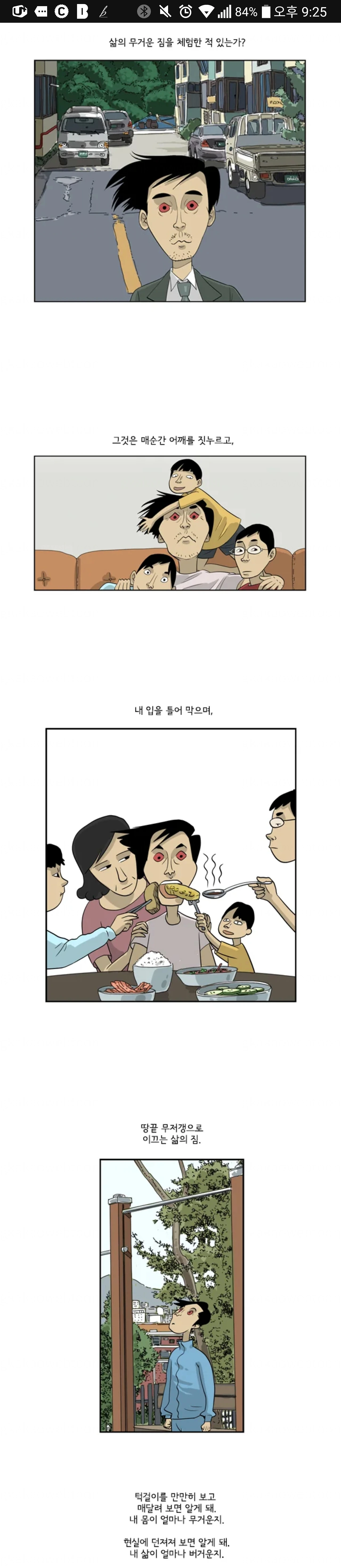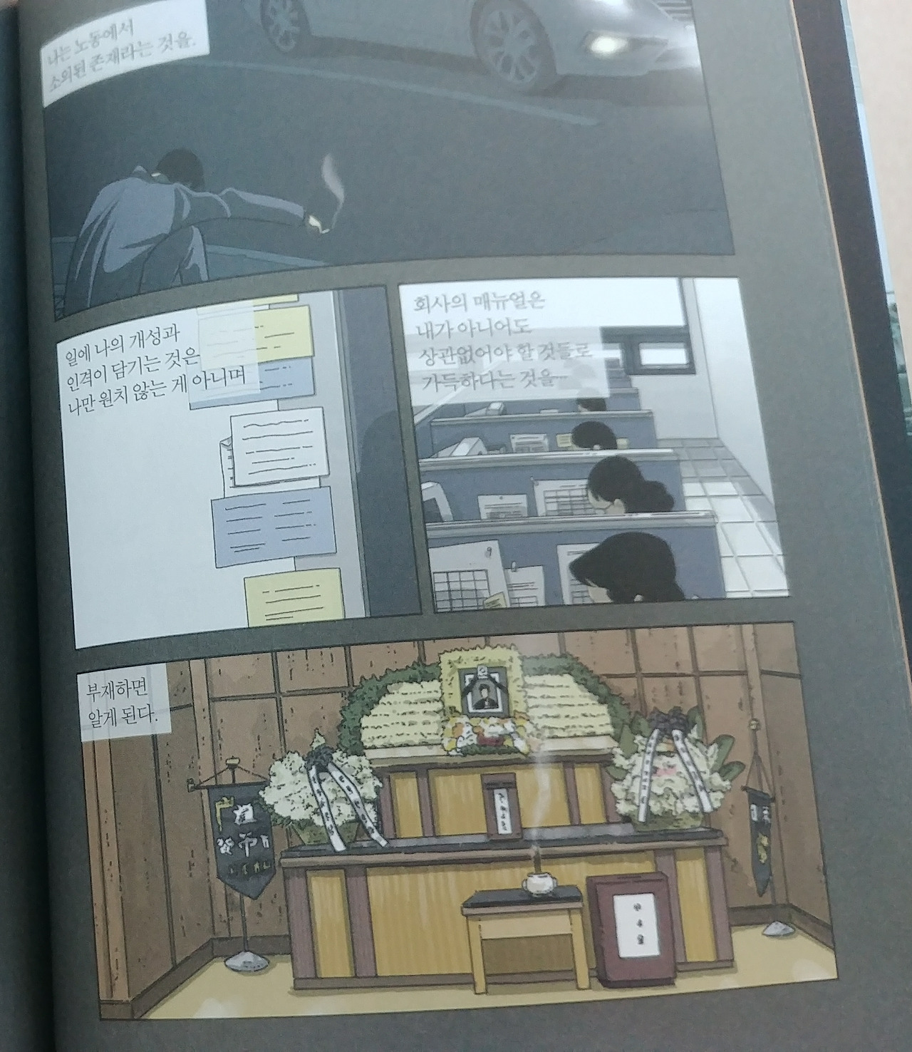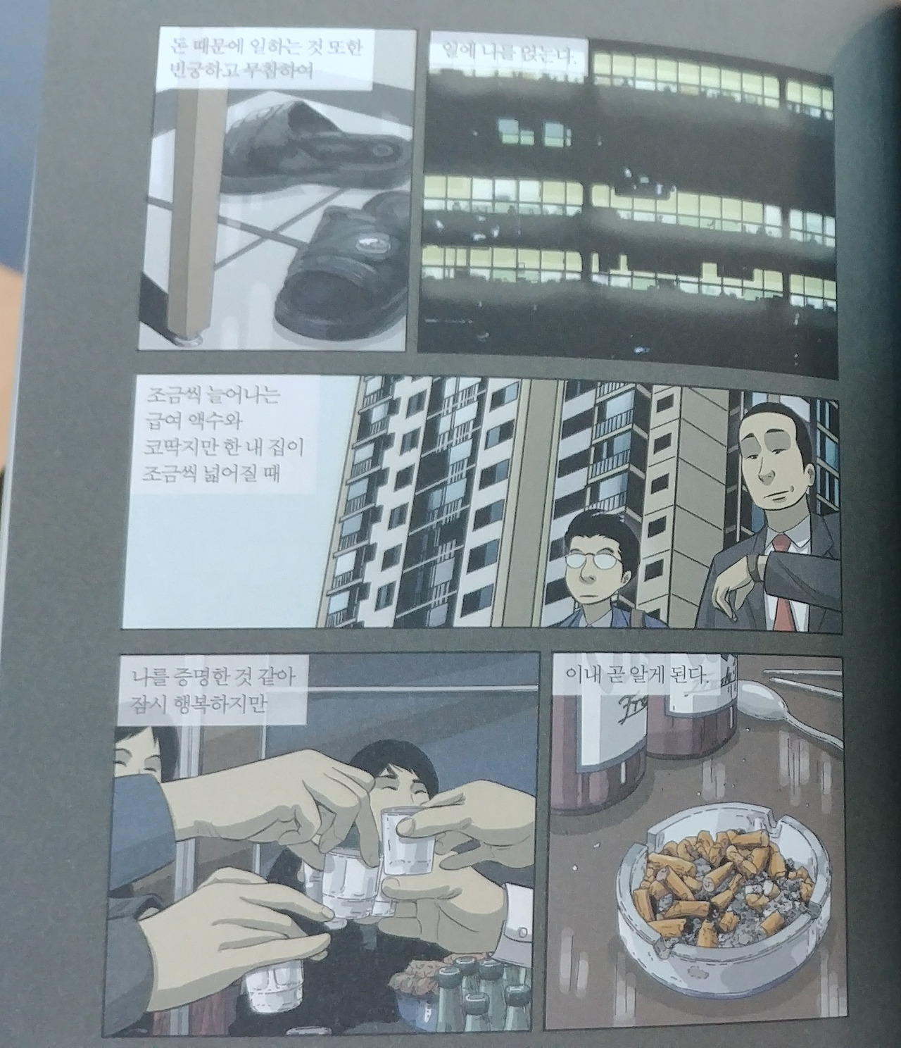 돈 때문에 일해야 한다는 진실이 수용하기 버겁기에 일에 나 자체를 얹게 되는 직장인. 조금씩 늘어나는 급여 액수와 조금씩 커지는 집 평수로 나 자신을 증명하는 것 같지만 진실은 그저 노동자는 노동에서 소외되어 있고 노동의 주인이 아니라는 담백한 진실... 내가 하는 그 일은 내가 아니어도 상관없으며 내가 없어지면 쉽게 대체된다는 슬픈 진실... 그렇기에 오 팀장은 자기 부하든 상사든 사실 모두 다 바둑판의 미생마에 불과하다는 것을, 홀로 버텨내기 힘들기에 옆에서 같이 걸어주려는 것이 아닐까