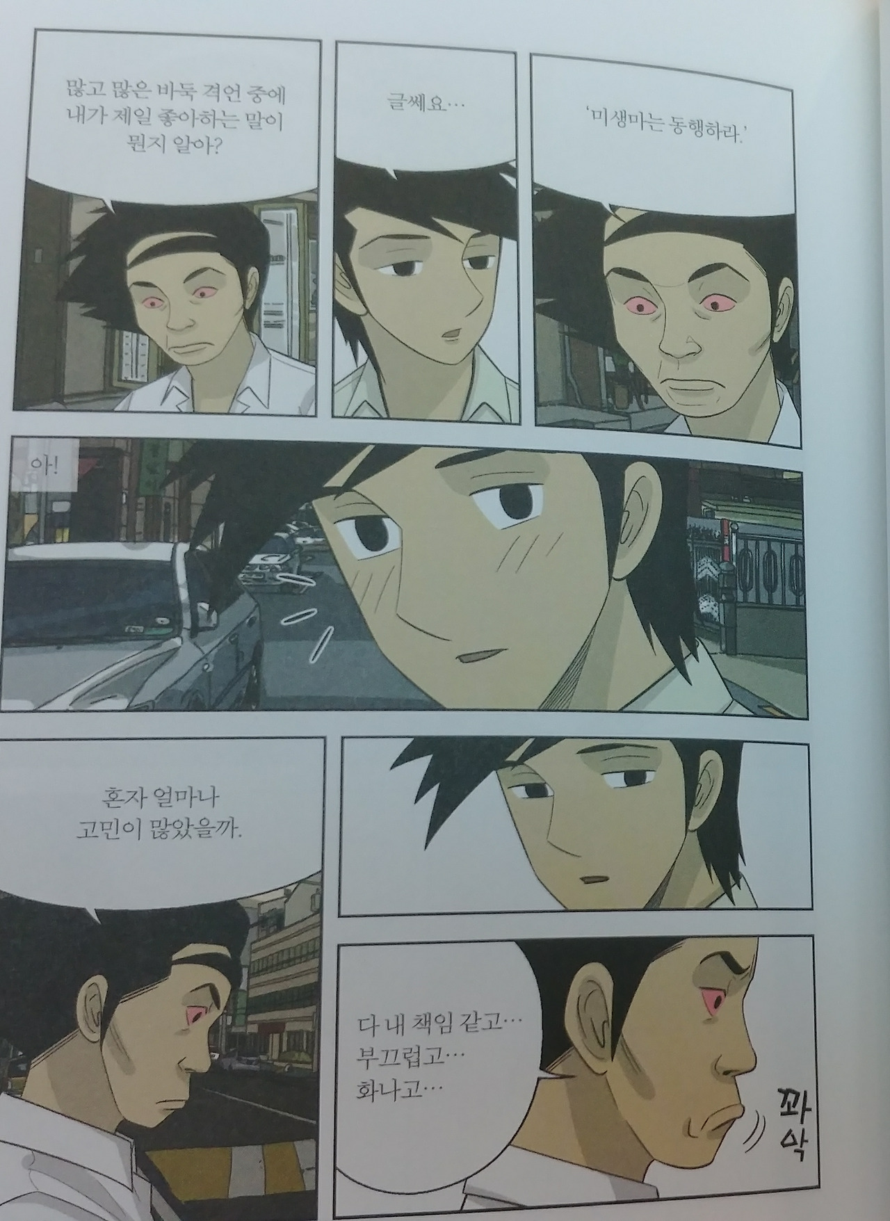 오 팀장이 이렇게 미생마와 동행하라는 명언을 그 수많은 바둑의 명언 중에서도 첫째로 꼽는 이유는 무얼까. 그건 아마 미생 시즌2 중에서도 가장 화제가 되었던 에피소드인 오상식의 상사가 사망하고 그의 장례식을 지키다가 눈이 빨개지는 에피소드 때문이 아닐까...