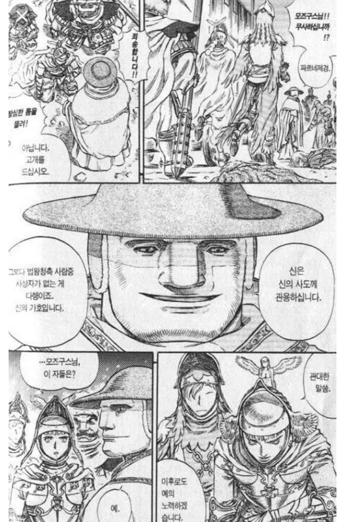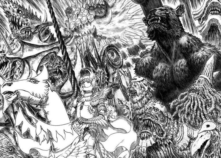 베르세르크는 20년 넘게 연재중인 미우라 켄타로의 판타지 만화 걸작으로, 위 장면처럼 작화 하나하나에 엄청난 공을 들이기 때문에 연재가 느리지만 전세계적인 팬덤을 거느리고 있다. 주인공 가츠는 매의 단 용병으로 살다가 용병대장인 하얀매 그리피스에게 배신당해서 그에게 복수를 하러 떠나는 긴 여정이 주요 스토리이다. 또한 스토리의 큰 줄기로 과연 선악이란 무엇인가 종교란 무엇인가 같은 큰 질문을 던지는데, 이를 담당하는 대표적인 캐릭터로 이단심문관 모즈구스를 들 수 있다