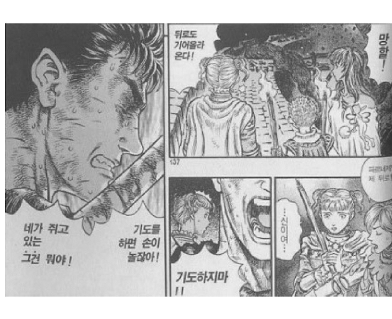 그렇다. 위의 글에서 차라투스트라가 설교하듯이, 종교인들은 신체를 경멸하고 배후 세계로 가길 원하지만 그걸 기원하는 기도마저도 신체가 없으면 불가능한 것이다. 하물며 괴물이 덤벼드는 전투에서는 말해 무엇하겠는가. 니체는 심지어 칸트의 철학 개념인 사물 자체를 비판하며, 신체야말로 바로 물 자체가 아니냐고 역설한다. 이에 대해서는 복잡한 내용이기에 칸트를 다루는 글을 따로 쓰도록 하겠다. 결국 우리는 우리의 신체가 아니고서는 그 어디도 갈 수 없는 존재인 것이다. 그렇기에 베르세르크를 보지 않은 사람들에게조차 유명한 다음의 명언은, 가츠가 말하는 것인지 차라투스트라가 말하는 것인지 분간조차 어려울 정도로 같은 논지를 품고 있다. 우리는 다른 어떤 피안의, 배후 세계의 천국이 아닌, 지금 여기에서 항상 우리의 몸으로 싸울 수밖에 없는게 아닐까.