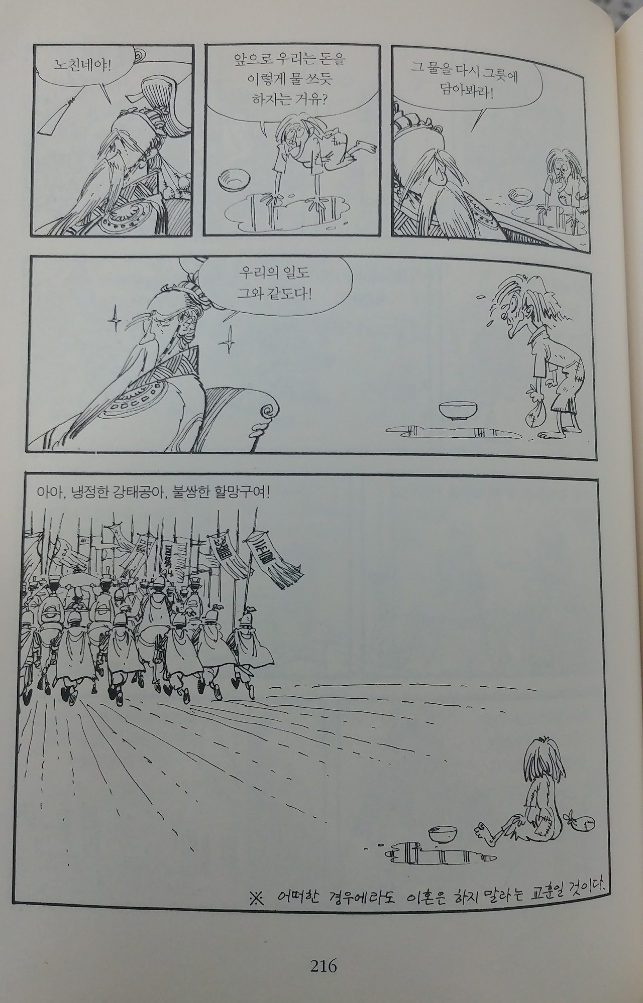 그 물을 다시 그릇에 담을 수 있으면 담아보라고 일갈하는 강태공. 우리의 관계도 그와 같다며 날카롭게 눈을 흘리는 태공망... 어릴 적 중학생 때 이 일화를 처음 접했을 때는 이 그만큼 부부관계는 중요하구나 힘들 때도 서로 헤어지지 말아야 하는구나 하고 생각했었더랬지. 하지만 나이을 먹으니 태공망의 속좁은 게 아닌가 실망감이 든다. 한 사람으로서 최고의 권세를 누리고 있고 70을 넘었으면 이제 살 날이 많이 남지도 않았는데 꼭 그렇게 야속하게 내쳐야 했을까...
