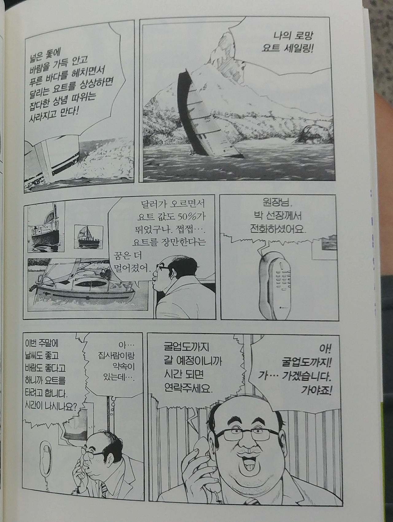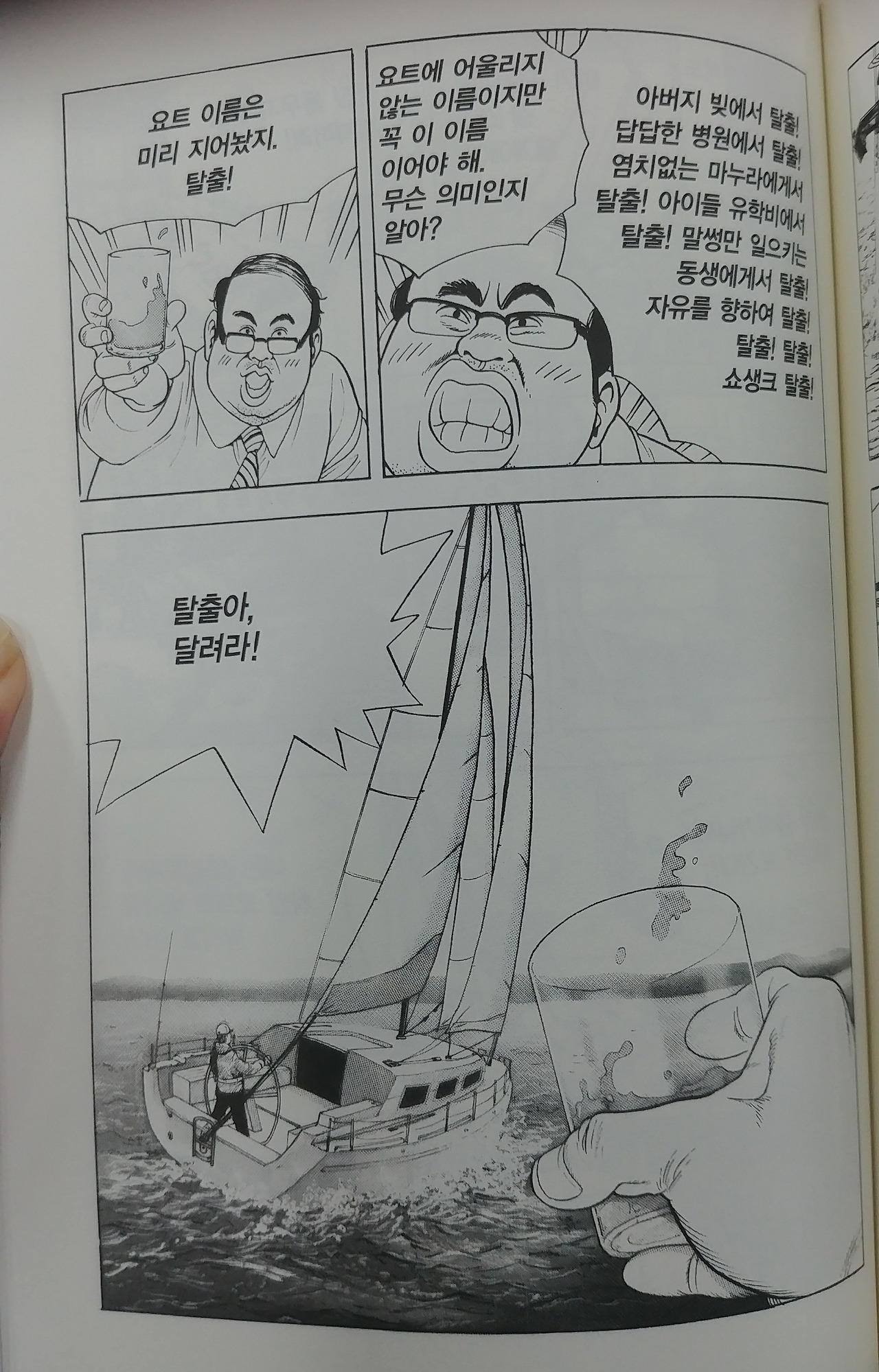 그런 와중에 오늘도 도서관을 방황하다가 책 두권을 골라냈는데 공교롭게도 이 둘 사이의 테마가 묘하게 겹쳐진다. 표지부터 번 아웃으로 불타버린 인문잡지 한편과 허영만의 만화 식객 24권이었다. 식객에서 한 의사는 남들이 부러워하는 직업과 수입이 있지만 그는 툭하면 가족으로 인한 스트레스와 빚 걱정에 그저 요트를 타고 탈출할 생각뿐이다. 언젠가는 자기 소유의 보트를 꼭 장만하고 말겠다는 그의 로망이 오늘도 의사 한 명을 버티게 한다. 아직 가지지도 못했지만 마치 아이 태명을 미리 정하듯 보트 이름도 탈출이라고 이미 지어놓았다.