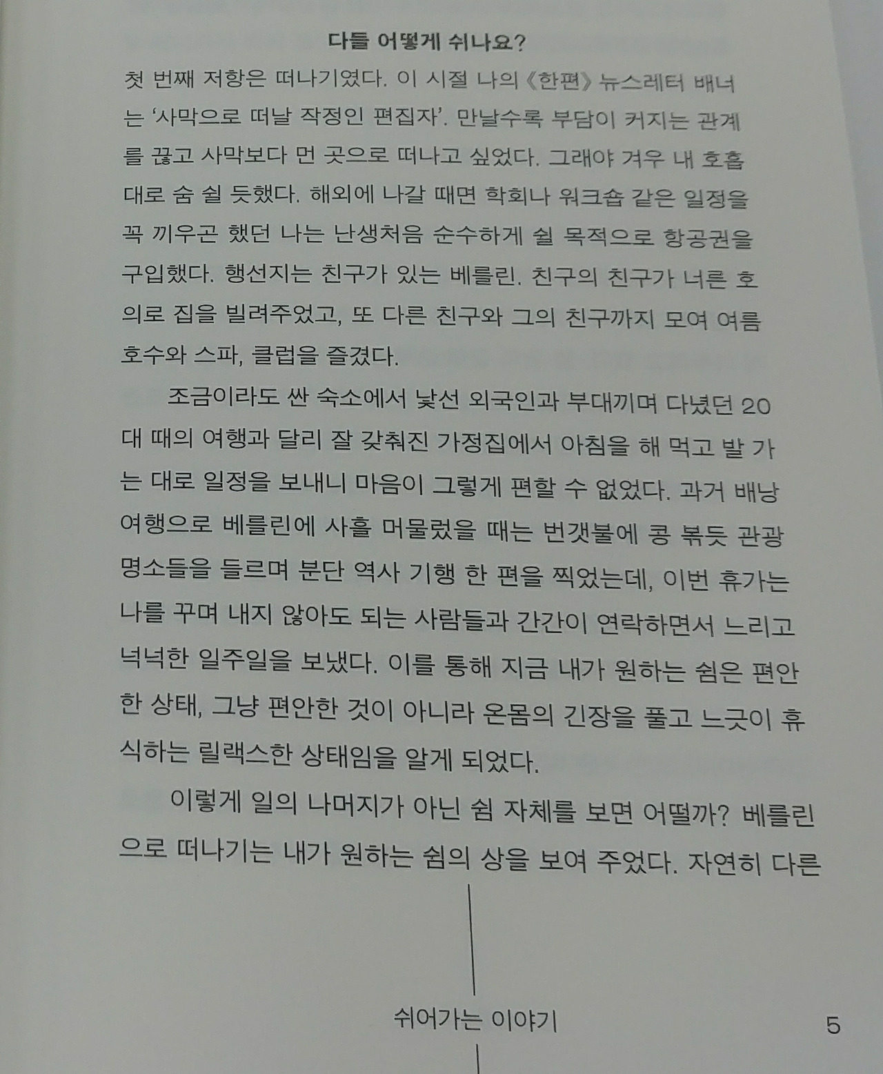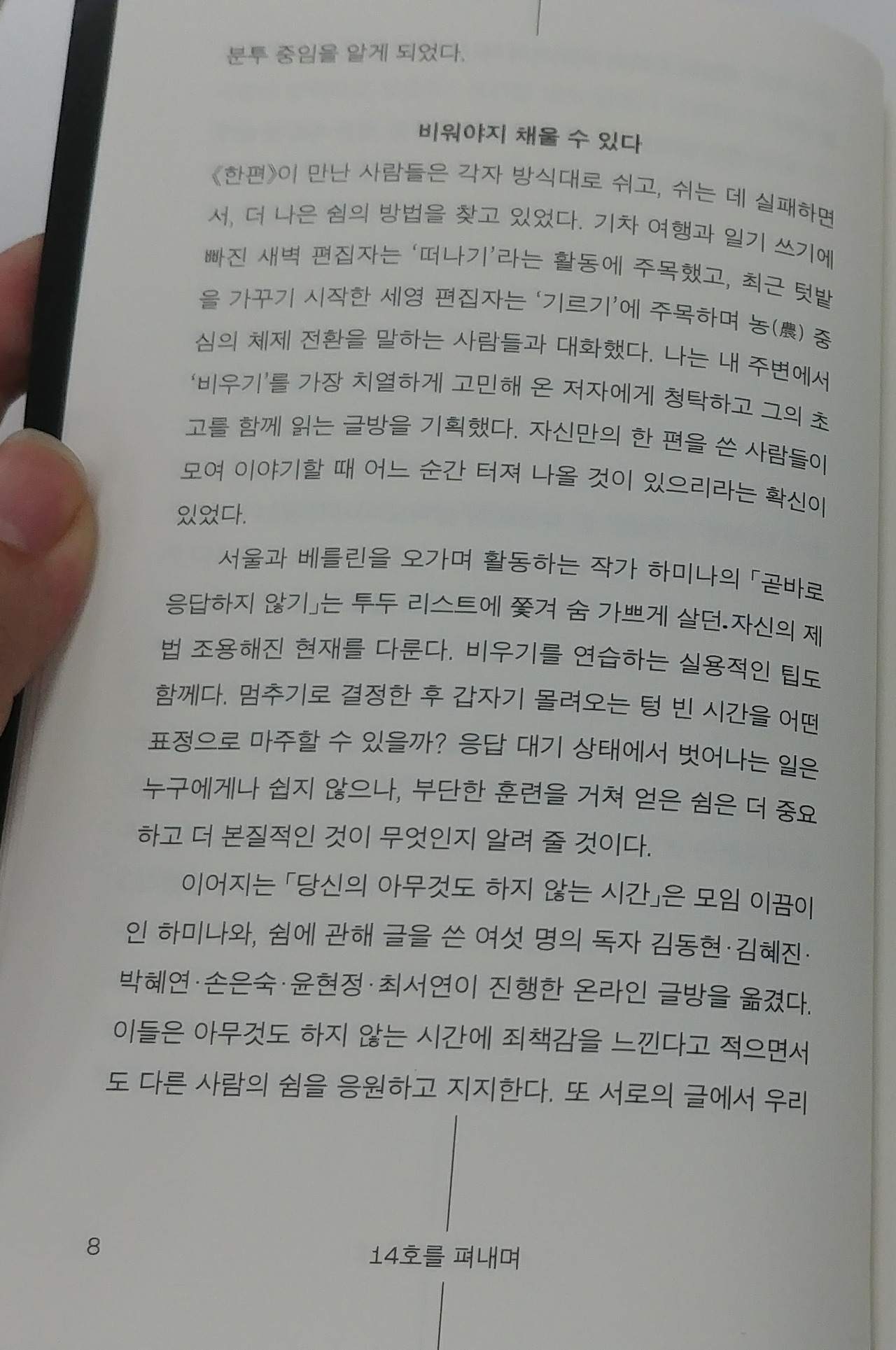 물론 사람마다 삶의 방식이 다르듯이 진정한 휴식의 방법과 고민도 다를 수 있다. 인문잡지 한편 14호 쉼은 바로 그런 각자의 휴식에 대한 이야기다. 누군가는 목적지도 정하지 않고 그저 서울의 떠나는 기차에 몸을 싣고 일기쓰는 시간 자체를 쉬는 시간이라 말한다. 또 다른 작가는 '기르기'에 주목하며 텃밭을 가꾸는 소중함에 대해 말하고, 또 어떤 사람은 서울과 베를린을 왕복하는 와중에 '곧바로 응답하지 않기' 라는 연락의 스트레스를 차단하고 관리하는 방식에 대해 말한다. 이 각자의 이야기들은 휴식은 곧 무언가를 비우는 활동이라는 것과도 연결해볼 수 있으려나.